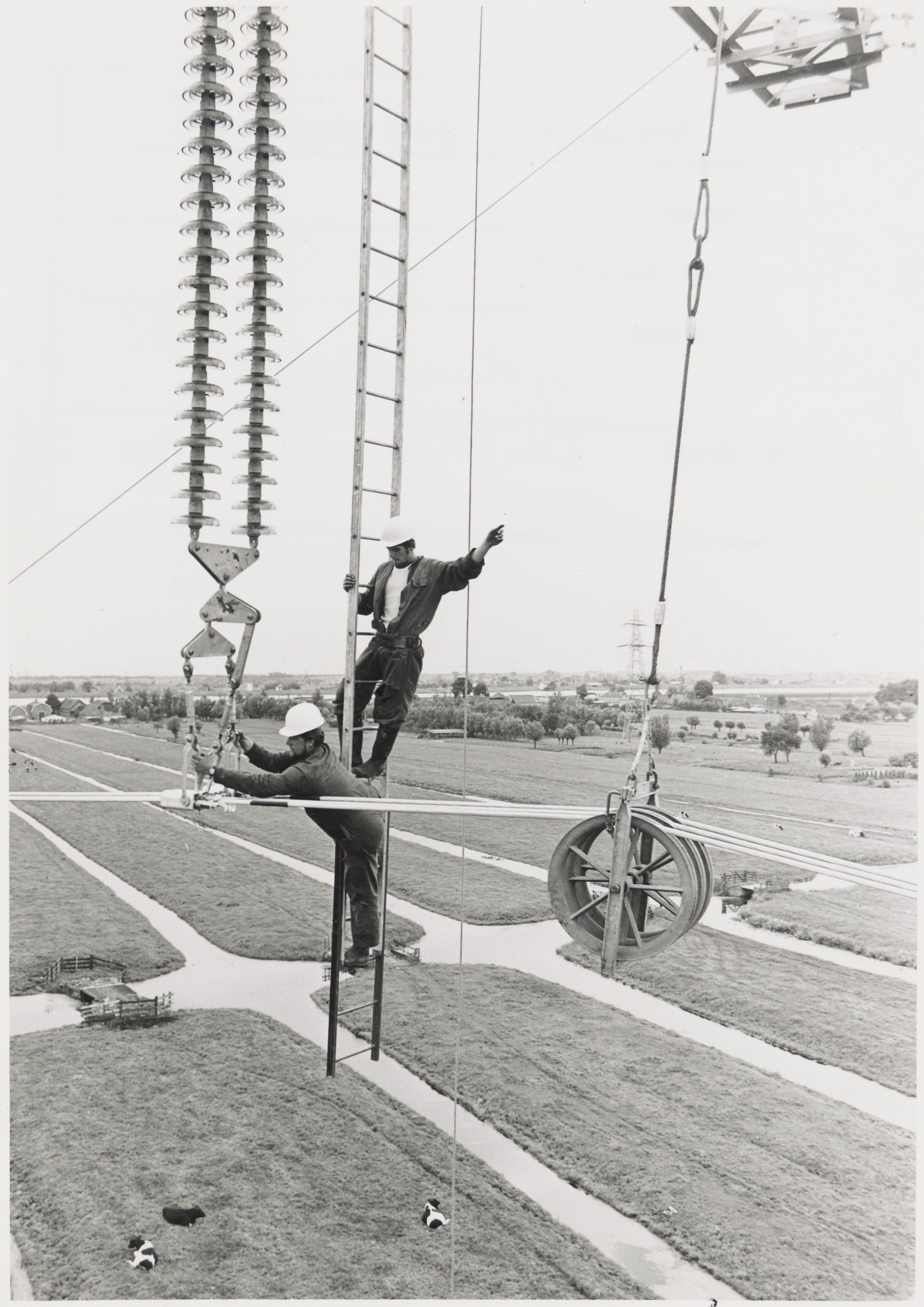 De lijn is onderdeel van het landelijke 380 kV-koppelnet welke op haar beurt weer met het buitenland verbonden is. Op de achtergrond een mast in de voormalige 150 kV-lijn Dordrecht - Krimpen welke in 1963 gebouwd werd. In 1973 werd de lijn omgebouwd voor 380 kV en werden de oude masten door nieuwe vervangen. Die nieuwe 380 kV-lijn liep van Dordrecht (Merwelanden) - naar Krimpen. De 150 kV-lijn van Dordt naar Krimpen werd in 1973 ingekort tot bij de A15 en loopt sindsdien naar Alblasserdam/Arkel. Deze foto zal rond 1969 gemaakt zijn.