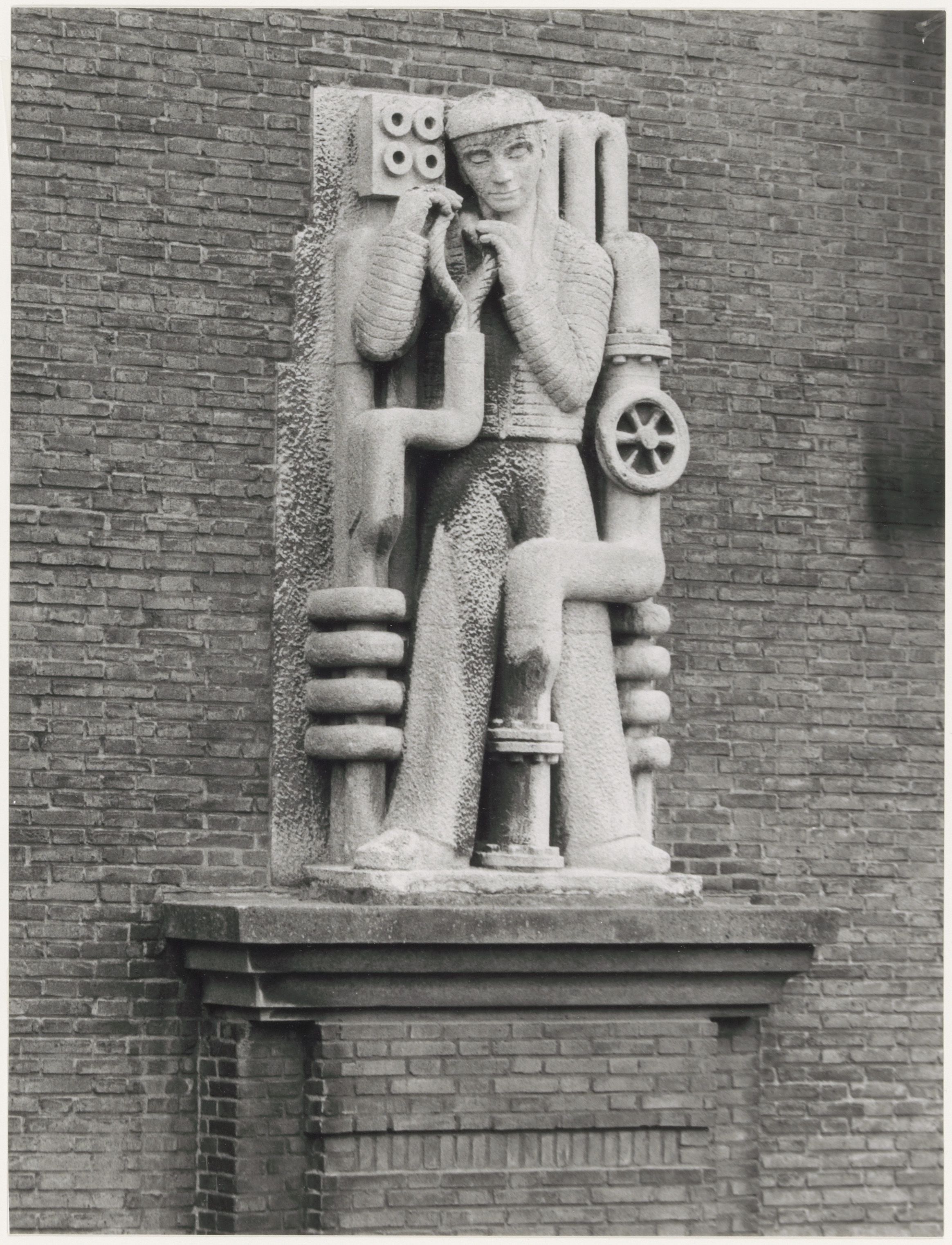 Beeld aan buitenzijde machinezaal van de Merwedecentrale op de Kerkeplaat.