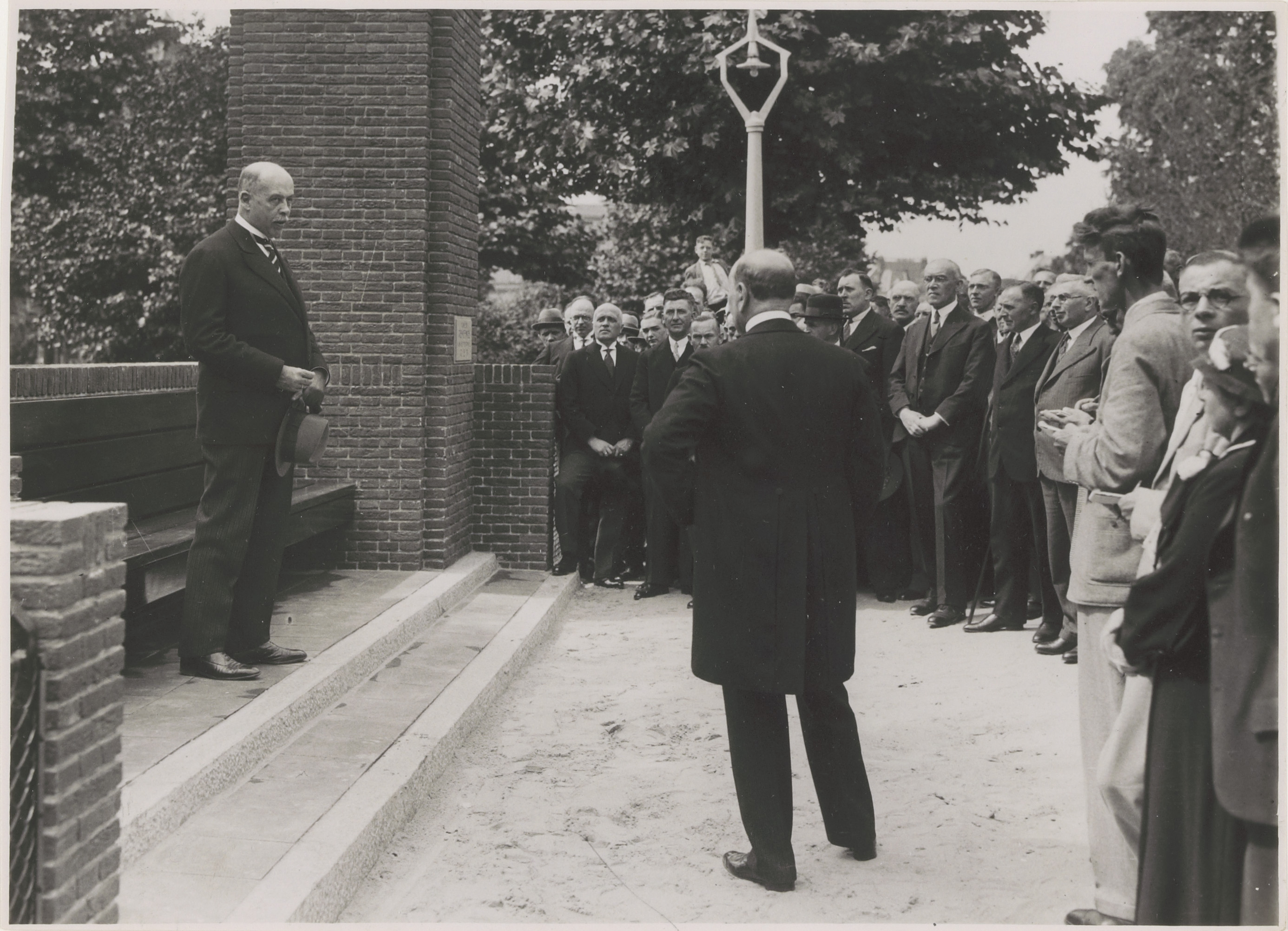 Toespraak van burgemeester De Gaay Fortman bij de ingebruikneming van de bank met klok aan de Vrieseweg, geschonken door het elektriciteitsbedrijf bij het 25-jarig bestaan.