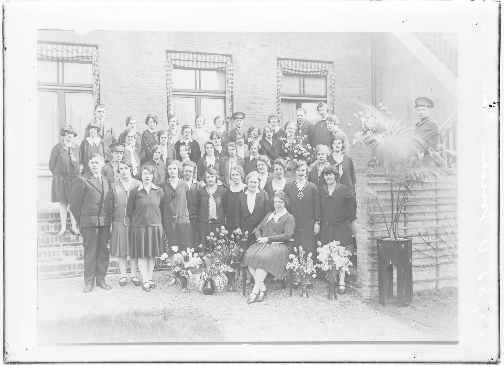 groepsfoto: meer dan 40 personen op trap (achterzijde gebouw; drie mannen met pet)----- BEERMAN 02-05-1929 fotonummer 12763 van Migchem p/a Bahlman [bron: www.dordtenazoeker.nl]