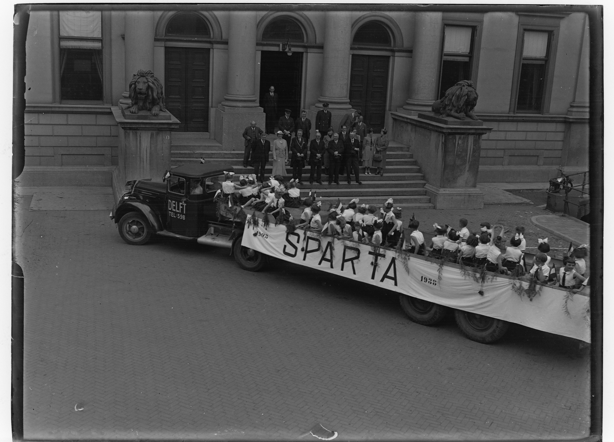 - 1903 - 1938 25 jarig bestaan gymnastiekvereniging Sparta tijdens een optocht langs gemeente bestuur op het Stadhuisplein