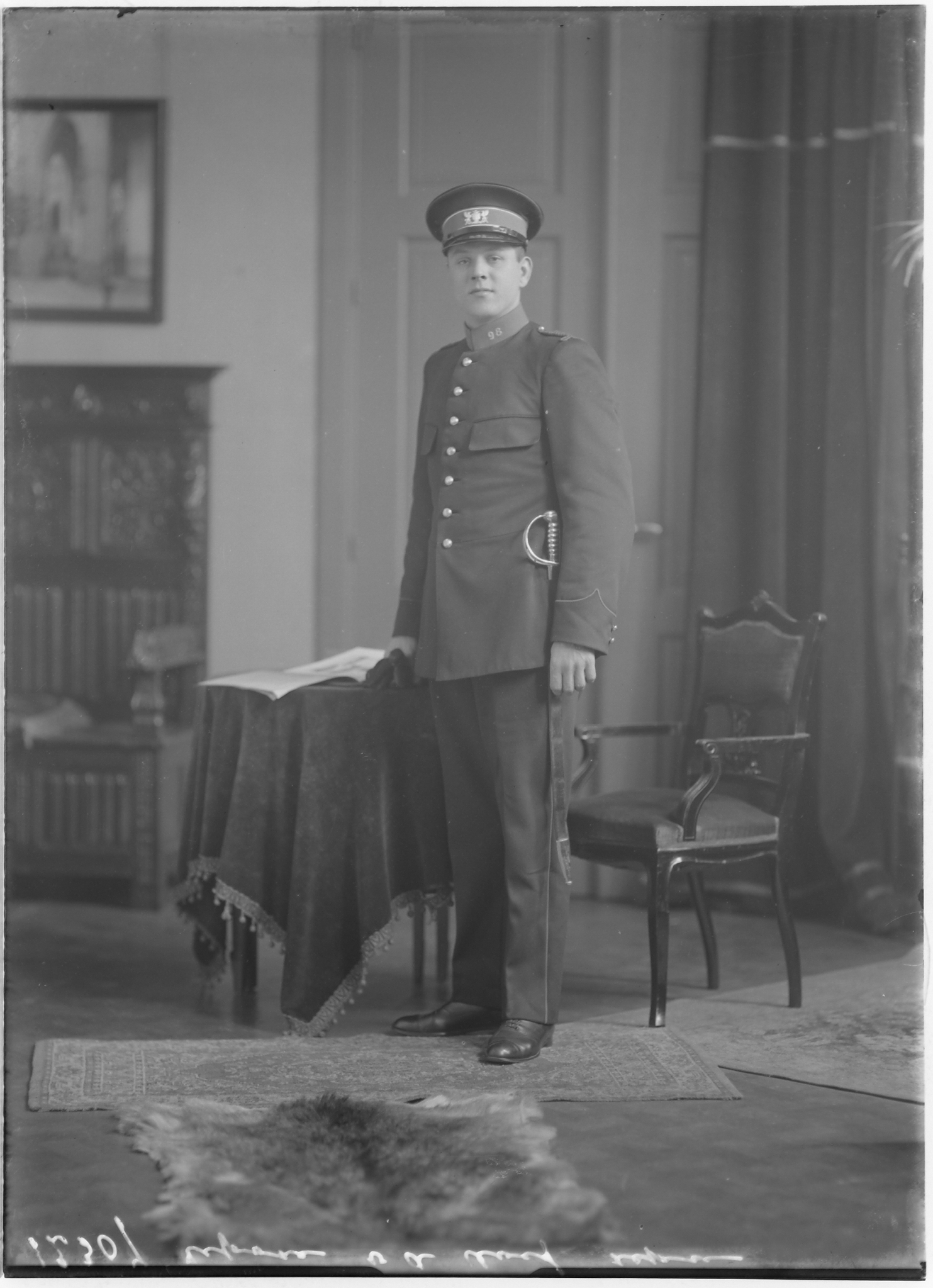 (nr. 12307!) staande man in uniform, politieagent, agent van politie (kraagnummer 98), zwaard --- BEERMAN 25-02-1929 fotonummer 12307 C. v.d. Hoef Veststraat 11 [bron: www.dordtenazoeker.nl] ---- Adresboek 1924: Veststaat 11 verloflokaal, Veststaat 11* J. Kloot, E. Kloot, W.F. Kloot, Chr. Kloot ---- zie 309_12307-1