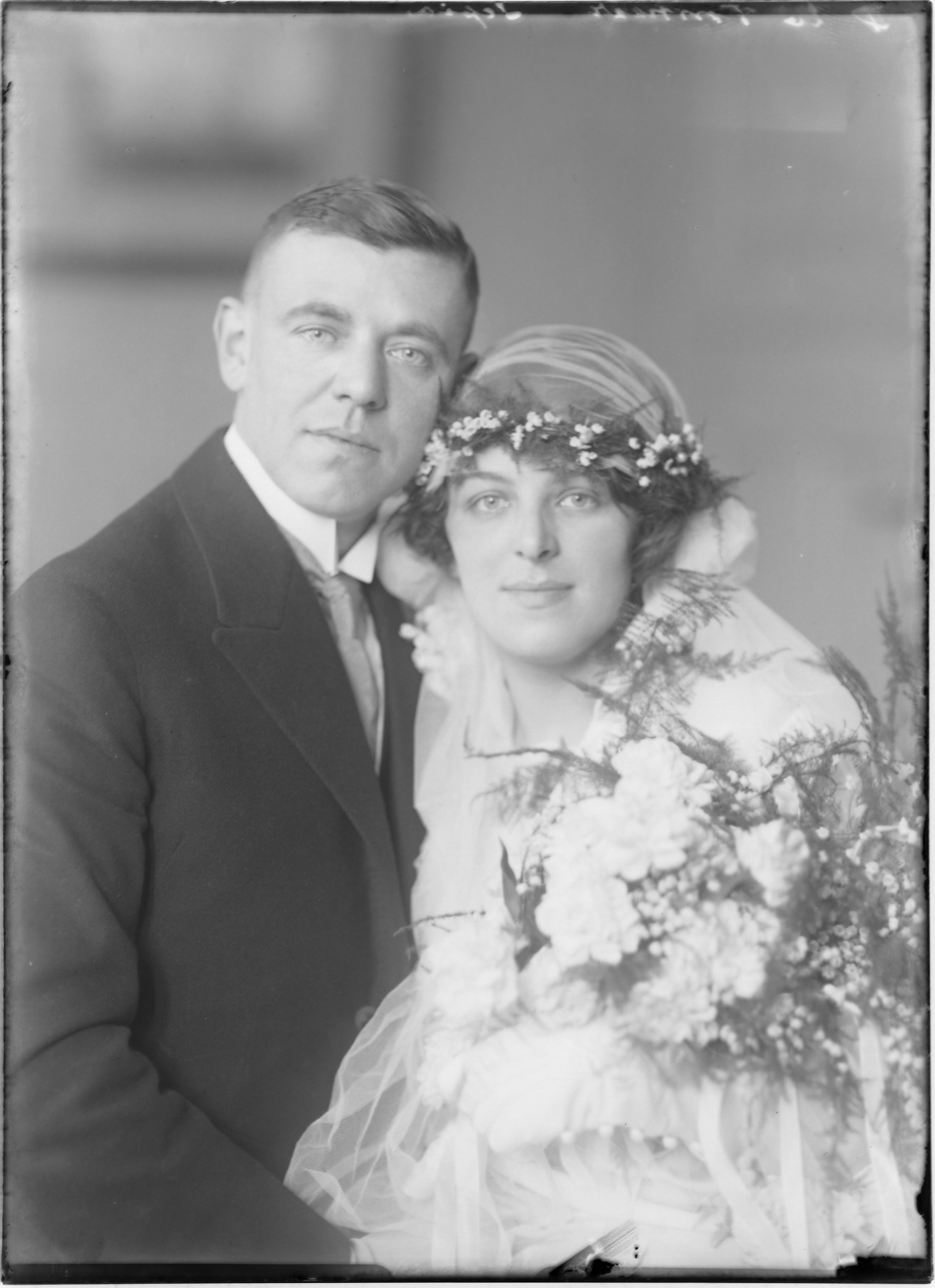 Johan Hendrik Anton Haussmann en Louisa Geertruida Tonnaer. 4 mei 1923. Haar ouders woonden op de Wijnstraat 77. Zie overige foto's Tonnaer.