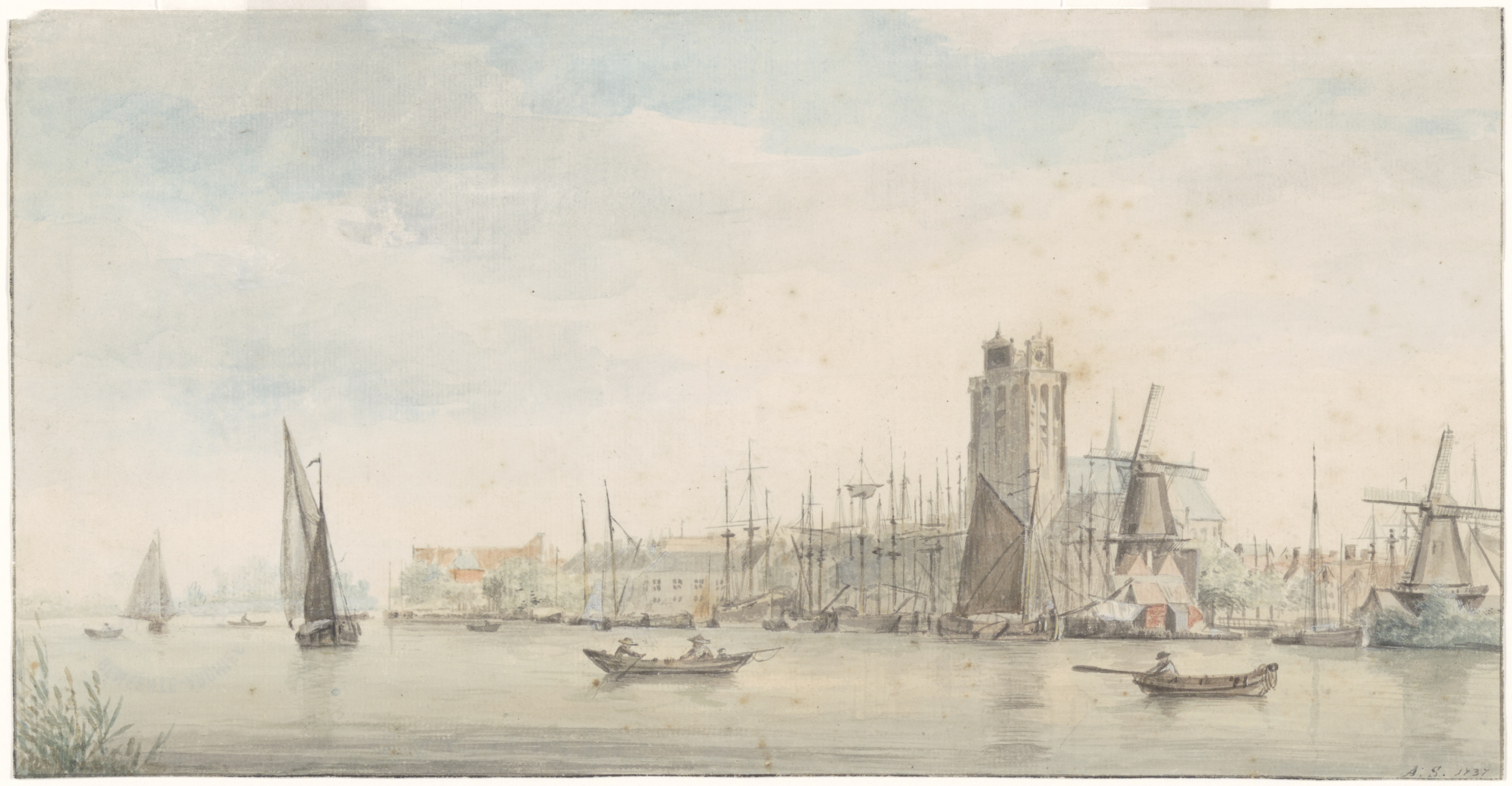 - Gezicht op de stad van de rivier van de Grote Kerk tot het pakhuis 'Stockholm' , 1737