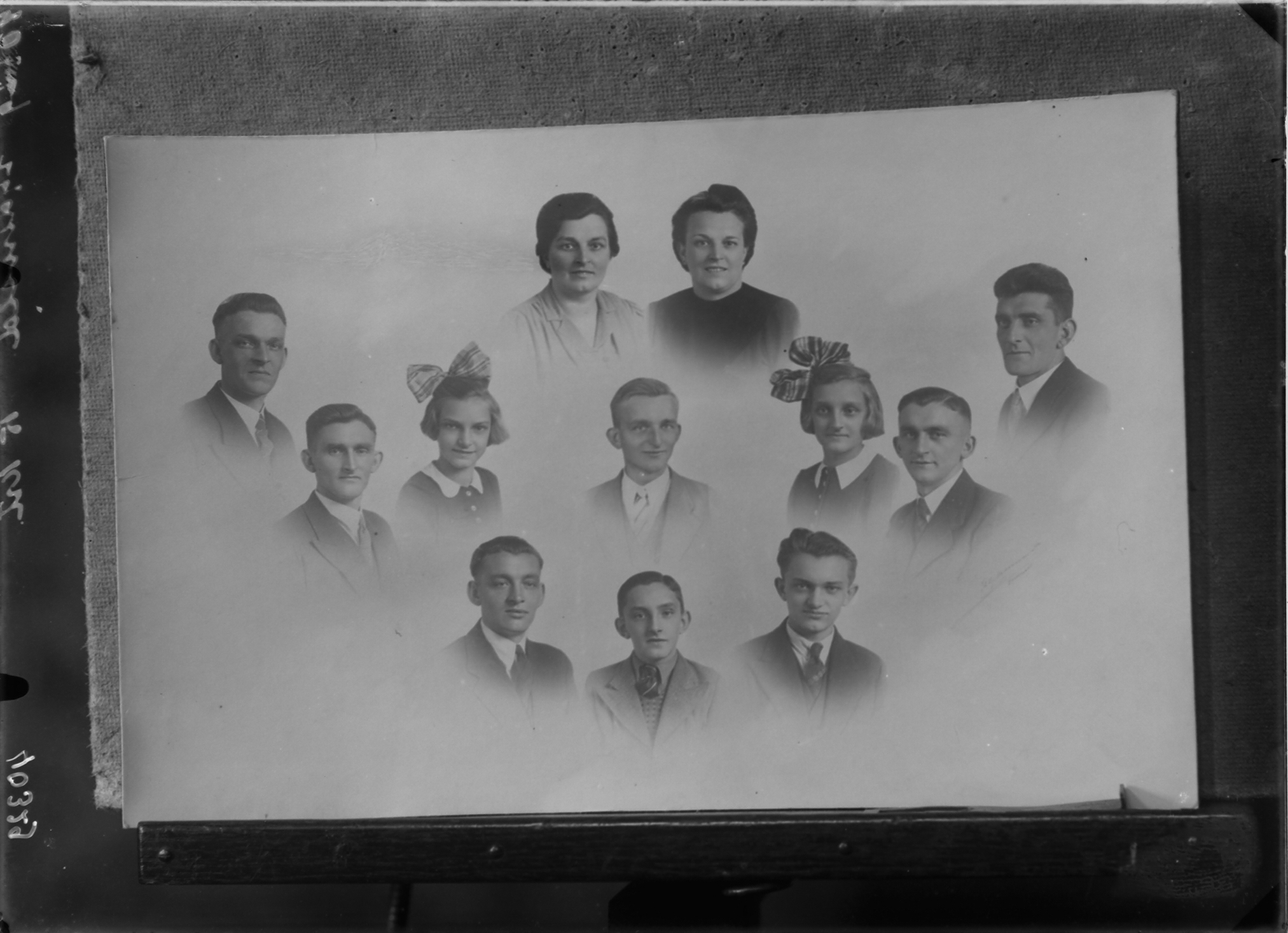 In totaal zie je de 12 kinderen van Marius en Betje Schenkel. 2 kinderen zijn direct na de geboorte overleden. Bovenin staat mijn tante Ella (of Elly) Schenkel. Eigenlijk was haar naar Pietje, maar dat vond ze een stomme naam. Zeer ongebruikelijk voor die tijd is zij in 1941 gescheiden en uiteindelijk haar zeer succesvolle eigen luxe kledingwinkel begonnen.