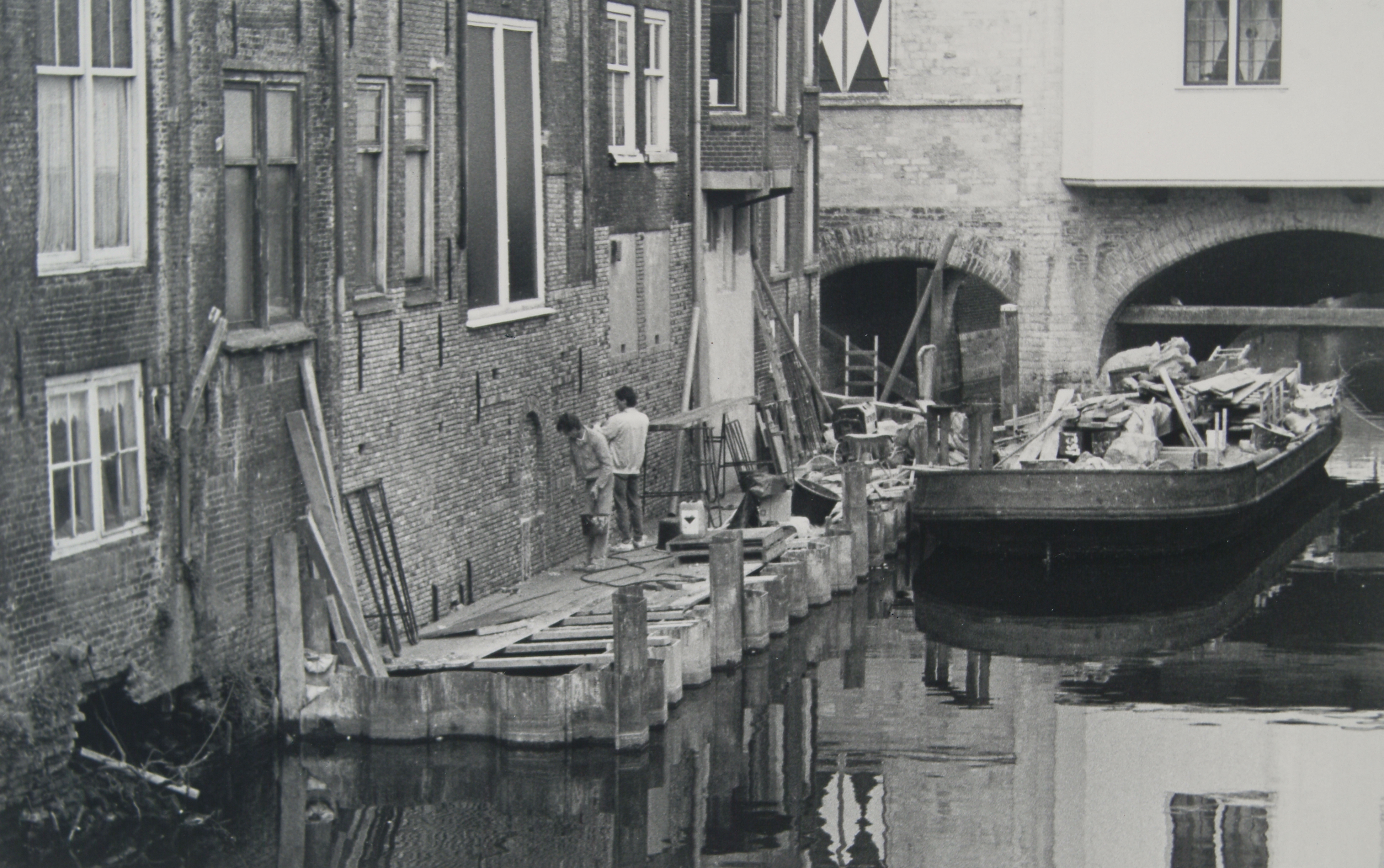 Herstelwerkzaamheden van watergevels in de Voorstraatshaven gezien van de Visbrug naar …