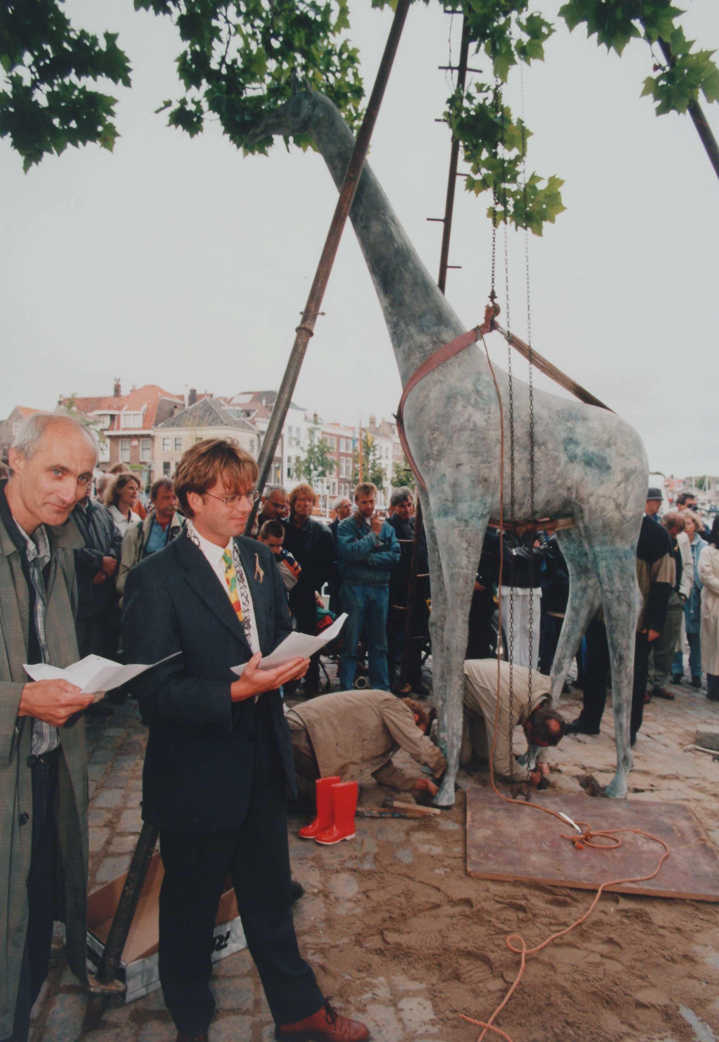 Plechtige neerzetting van het beeld van de giraf aan de Houttuinen. Links met keten en …