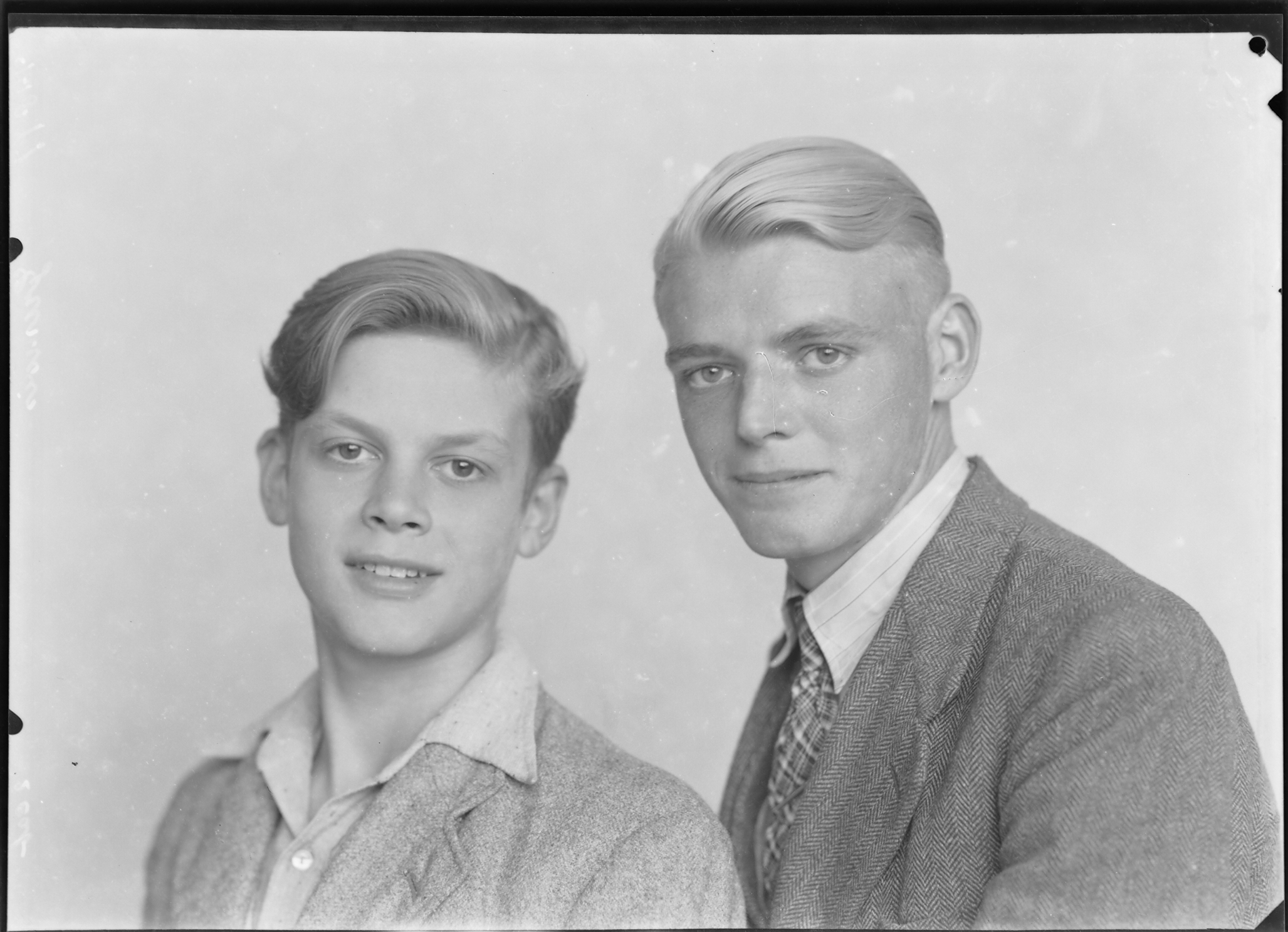 twee jongemannen ---- 14-09-1945 fotonummer 44877 J. Grinwis, Breedeweg A226 Ouddorp ZH [bron: www.dordtenaZOEKer.nl]