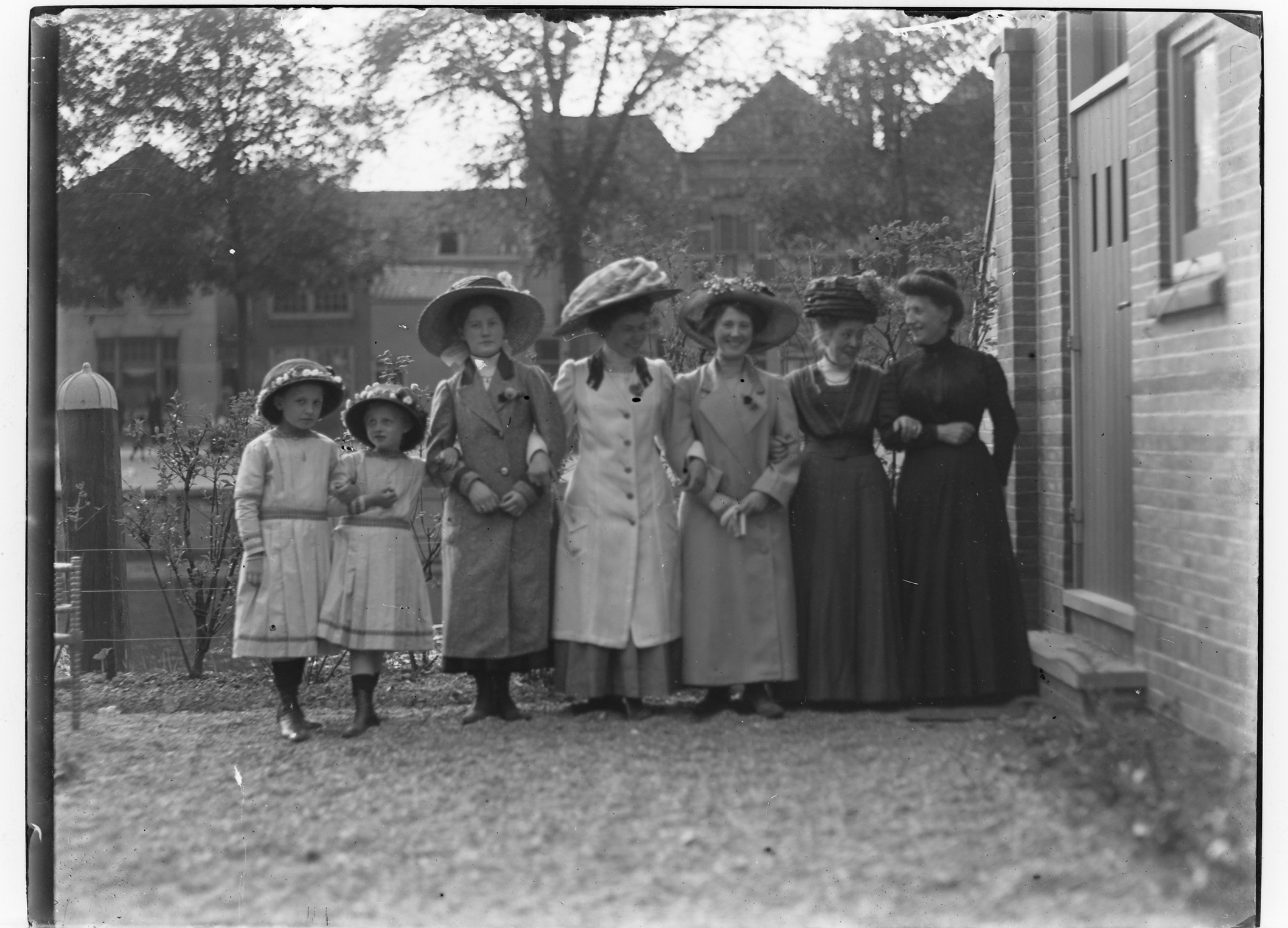 Deze vrouwen staan in de tuin achter het fotoatelier van fotograaf Tollens op het Vrieseplein 1. Dit atelier met bovenwoning werd gebouwd in de periode juli 1910 - mei 1911. Op de achtergrond zijn de huizen aan de andere kant van de Spuihaven aan de Vest te zien.