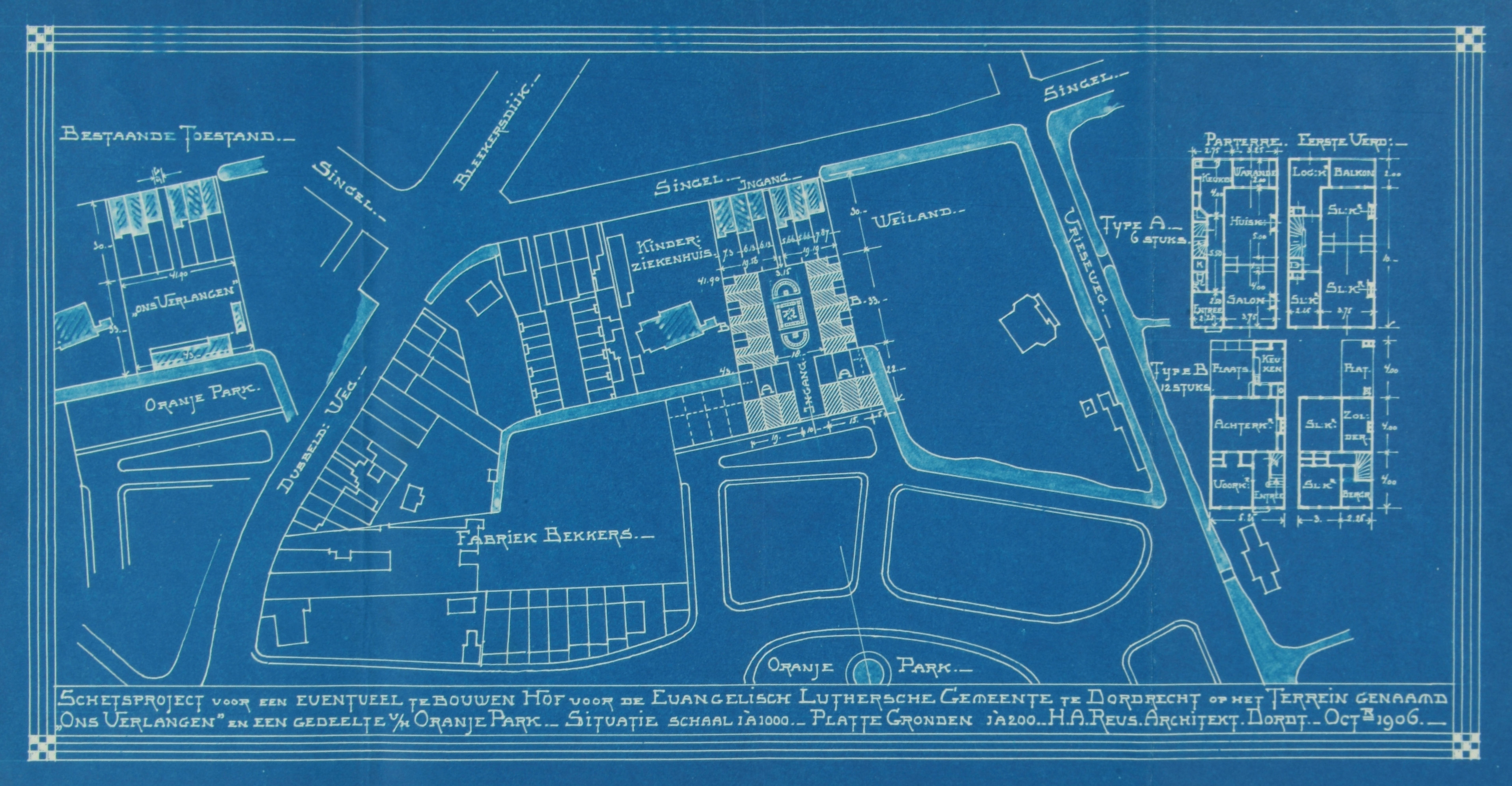 - Plattegrond van het gebied tussen Blekersdijk, Vrieseweg en Oranjepark met een niet-gerealiseerd plan voor de bouw van een hof voor de Evangelisch-Lutherse kerk op het terrein "Ons Verlangen" in een deel van het Oranjepark.