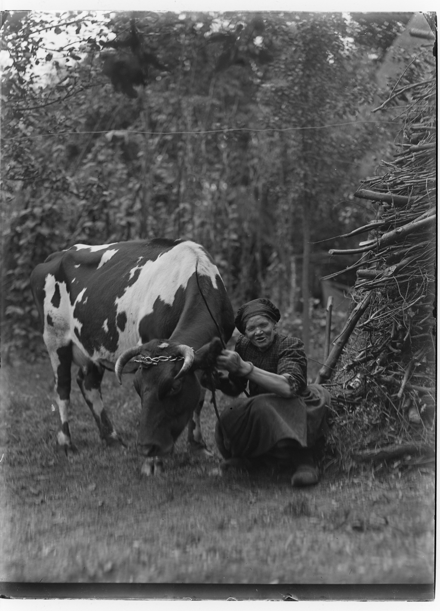 - Een boerin met één van haar melkkoeien. Voor Albers Creameries Limited, kunstboterfabriek. In een weiland in Sliedrecht