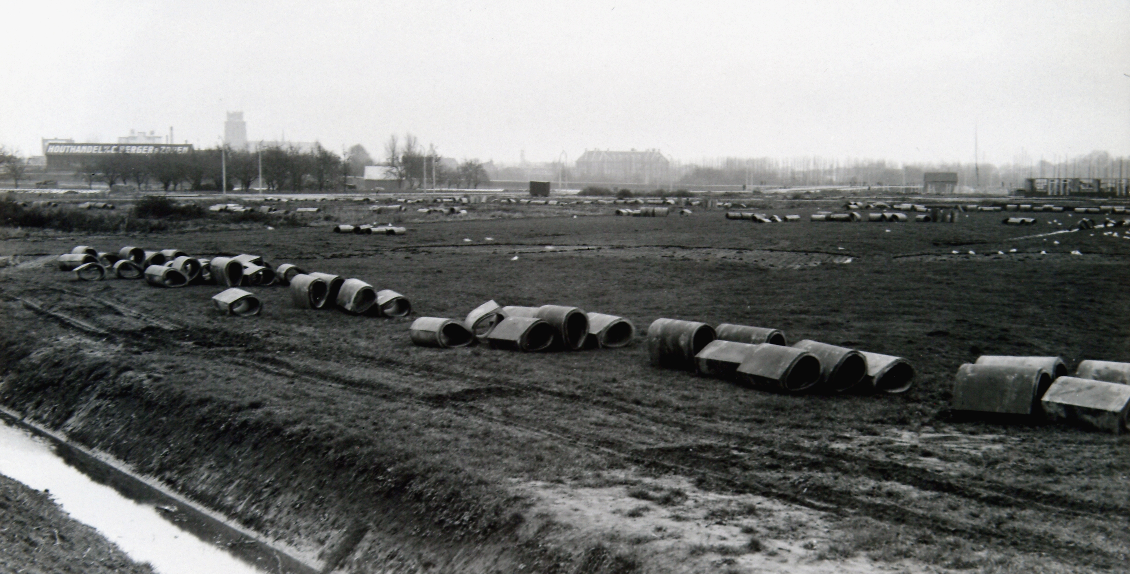 - De witte lantaarnpalen geven de Hugo de Grootlaan aan. De rioolbuizen liggen gereed voor de muziekwijk. Geheel rechts is de Viottakade.