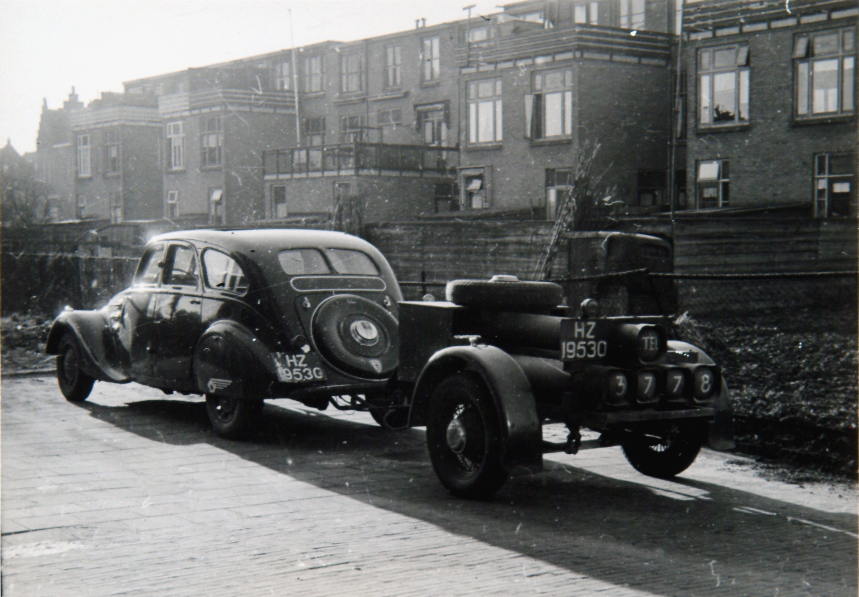 - Een taxi met aanhanger voor persgascilinders staat aan de achterkant van huizen in de Koninginnestraat (oostzijde, richting Havenstraat).