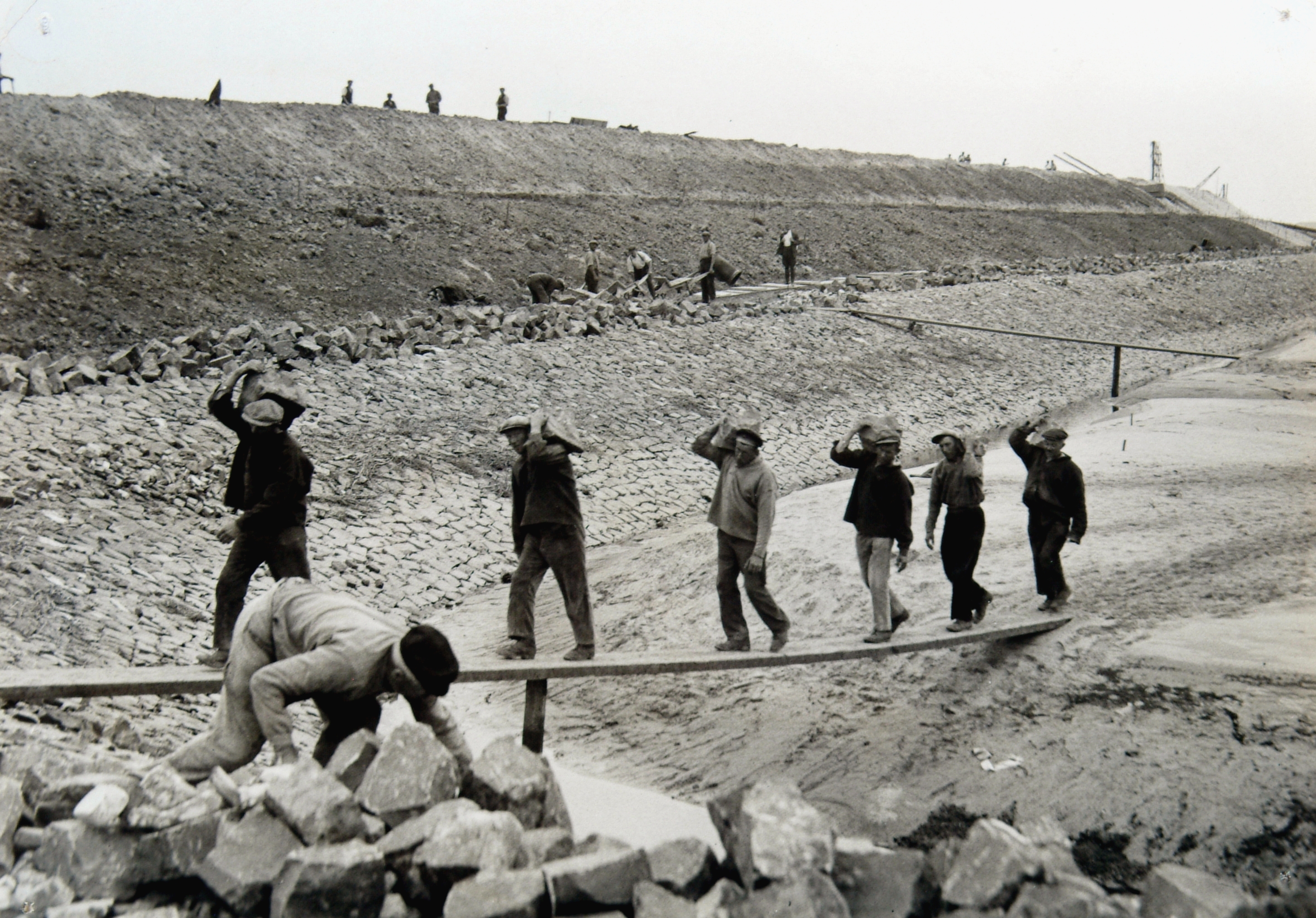 - Werkers sjouwen brokken steen voor de beschoeiing van de oprit van de verkeersbrug over het Hollandsch Diep.
