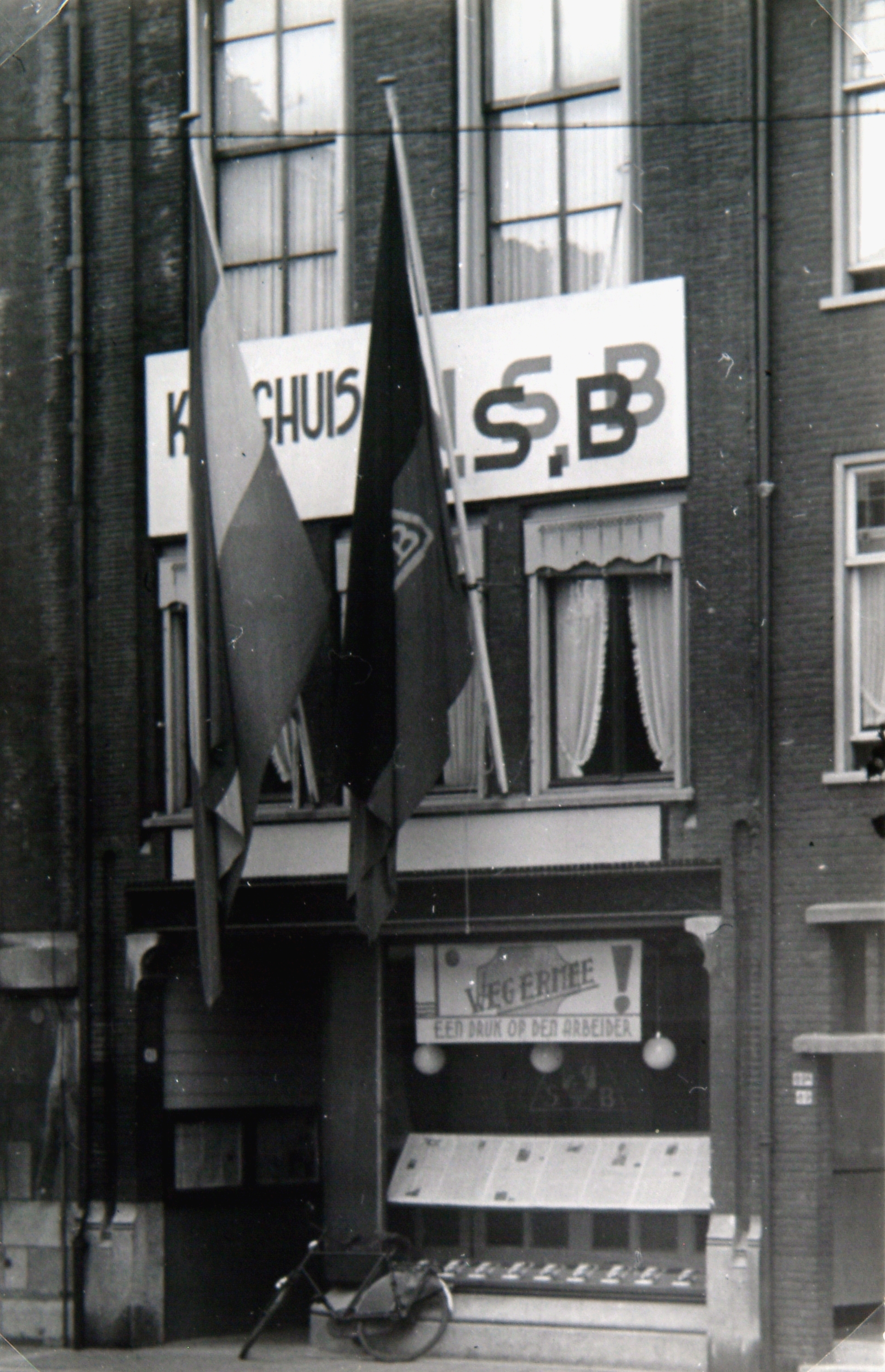 - Kringhuis van de N.S.B. in de Wijnstraat tegenover de Nieuwbrug. Het biljet met de tekst “Weg er mee” slaat op het rijwielbelastingplaatje.