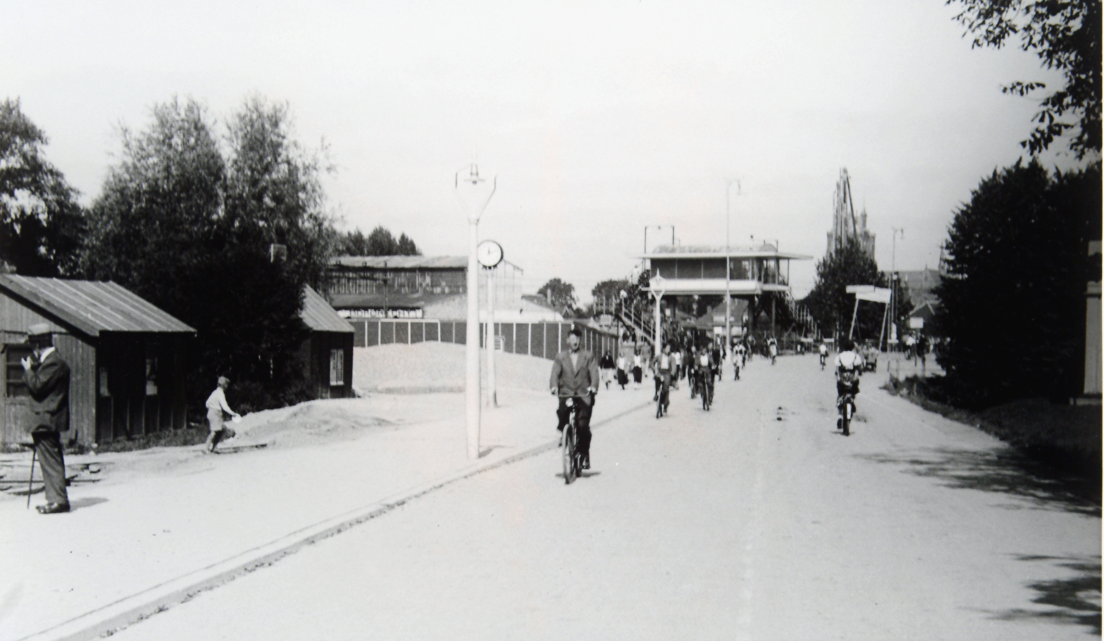De Krispijnseweg in de richting van de stad gezien. Links zijn werkzaamheden voor de aanleg van de Krispijntunnel. De trappen in het midden zijn van een voetgangersbrug over het spoor. Links daarvan de Lips-fabriek. die dit jaar zal worden afgebroken.