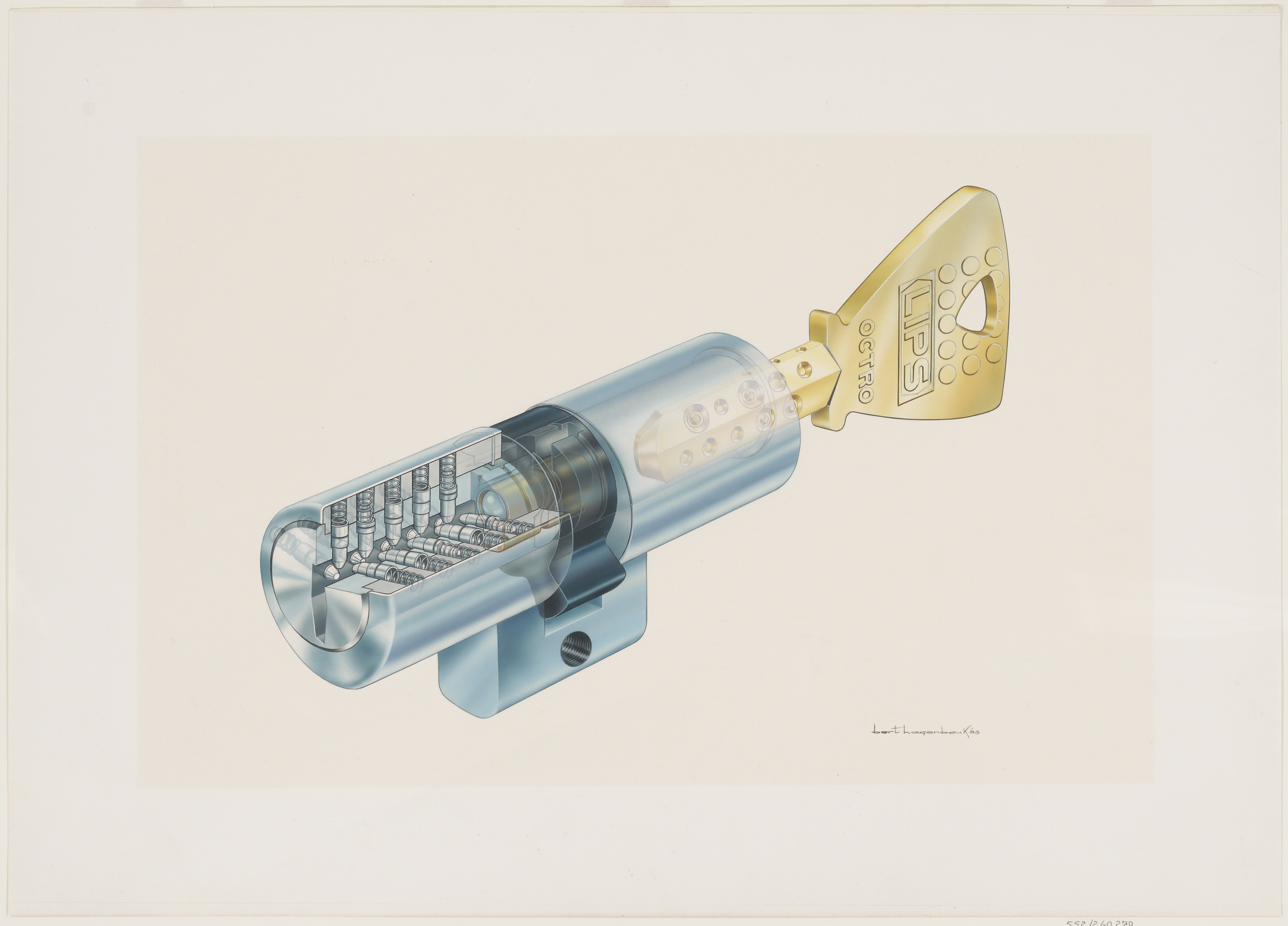 - Een doorsnede van een cilinderslot van de firma Lips.