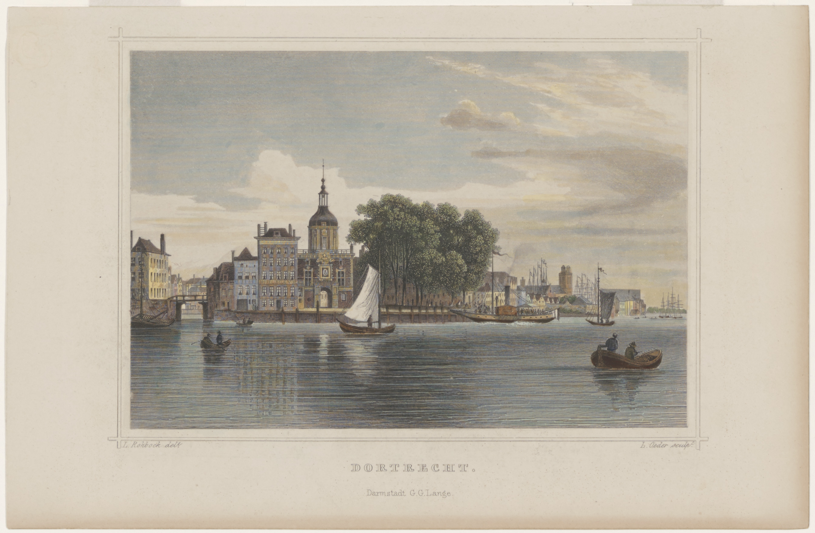 - Gezicht op de stad vanaf de Noord; links de ingang van de Wijnhaven, midden de Groothoofdspoort, rechts op de achtergrond de Grote Kerk.