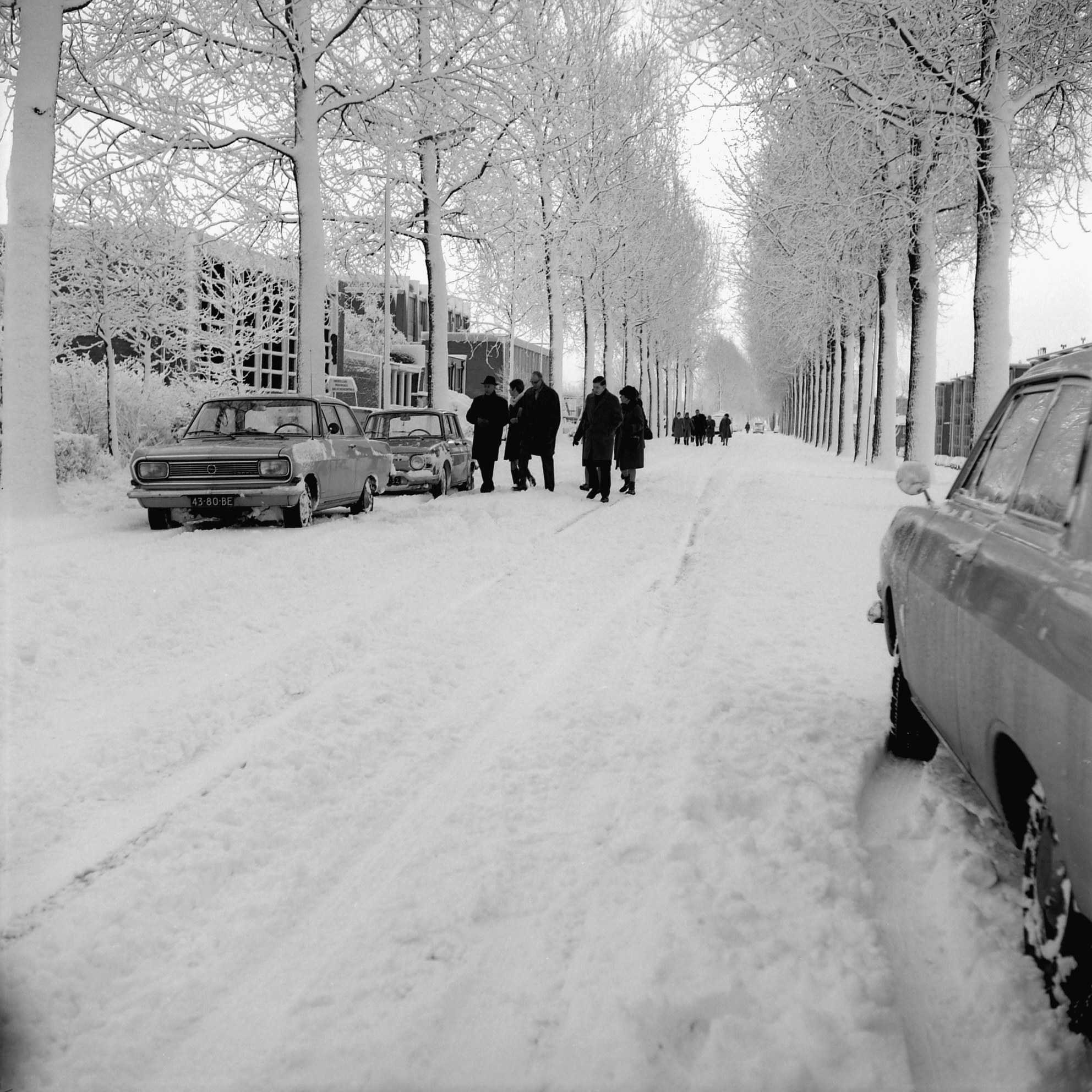 - De Noordendijk onder een dikke laag sneeuw. De school is het Gemeentelijk Lyceum.