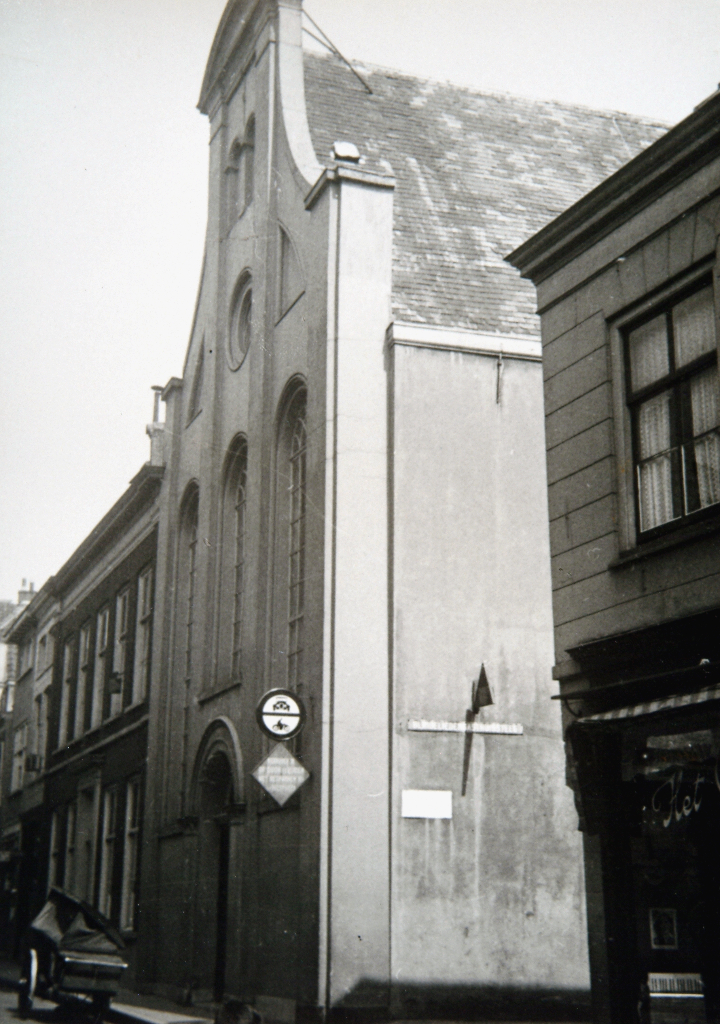 - De Vriesestraat, kijkend richting Voorstraat met de Evangelisch Lutherse kerk op de hoek van de Blindeliedengasthuissteeg (rechts).