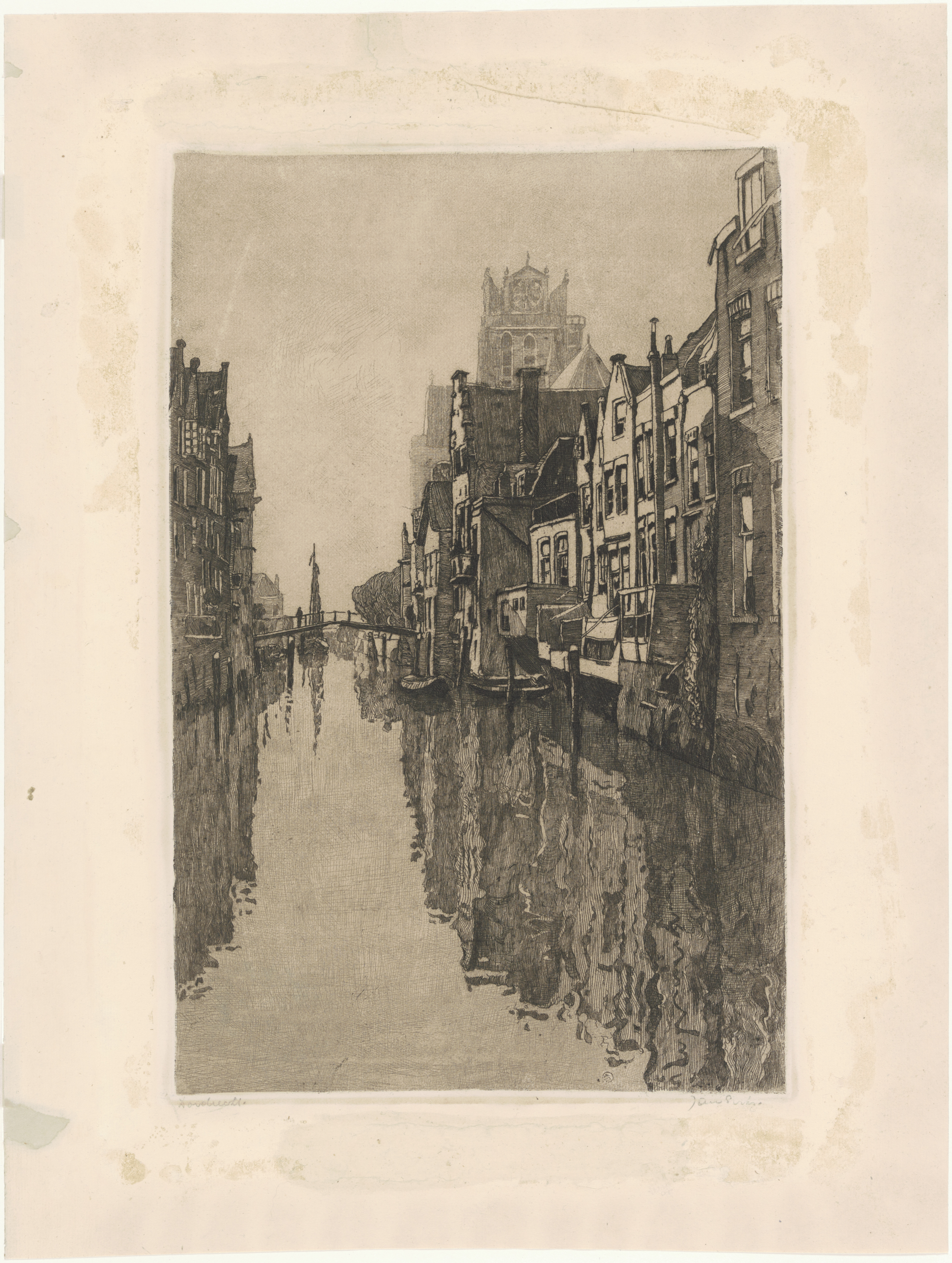 Tekening van de Voorstraatshaven vanuit het oosten op de Pelserbrug en Grote Kerk.