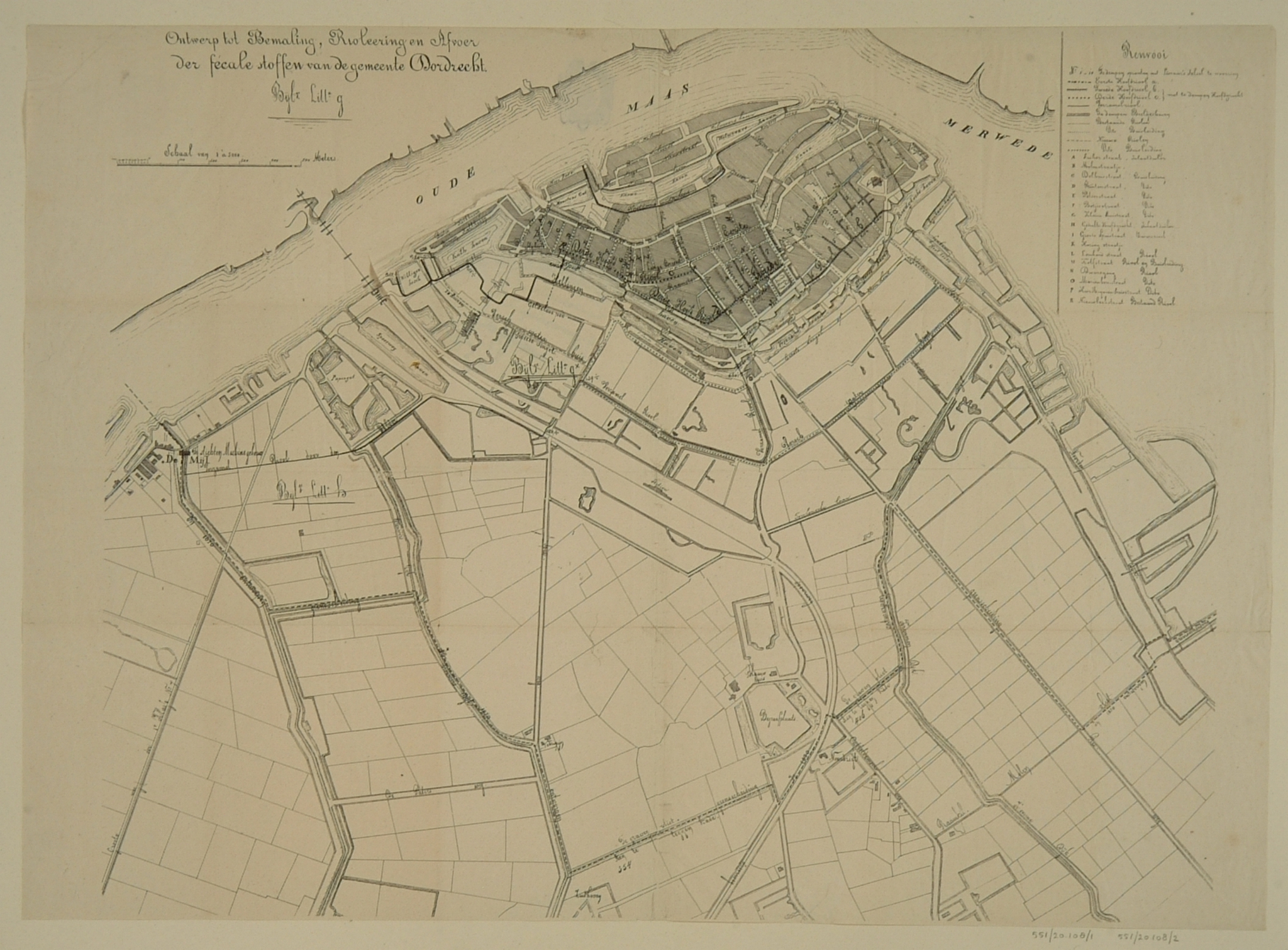 Plattegrond van de stad met hierop aangegeven het ontwerp tot bemaling, riolering en …