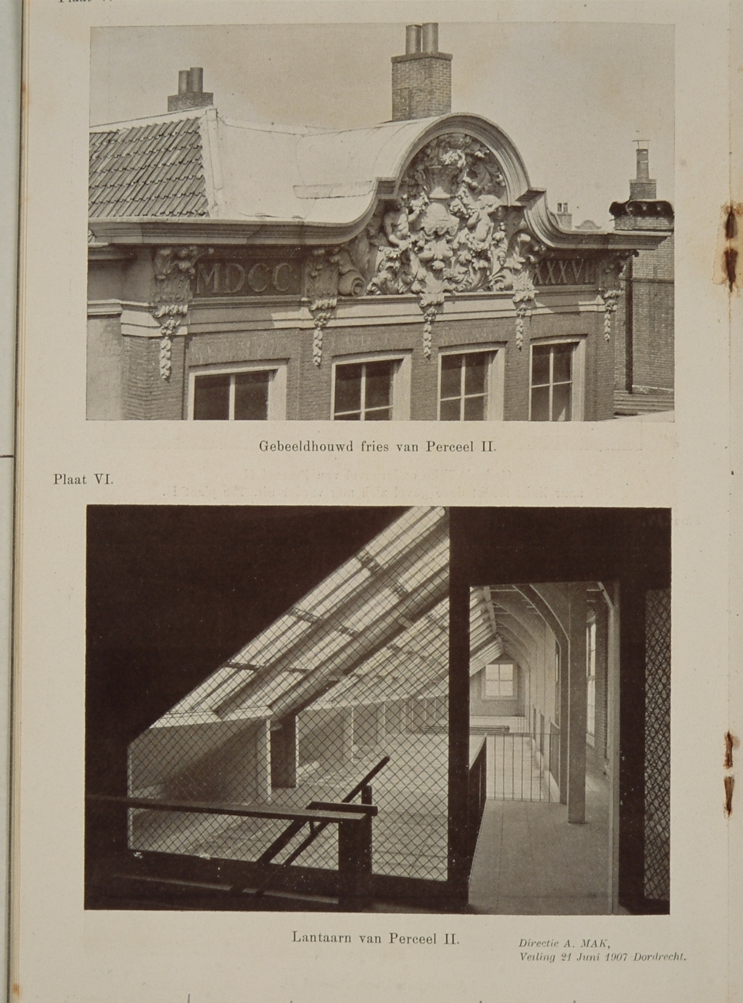 551_75047-1 t/m -17 betreft de catalogus voor de veiling op 21 juni 1907 door de firma Mak van de panden Wijnstraat 93, 95 en 97, ter plaatse van de huidige percelen Wijnstraat 169-203 en 205-207 en de 's-Heer Boeijenstraat. Na de veiling zijn de panden in 1907 gesloopt om plaats te maken voor de villa van Lotsy. Een detailopname van de versiering van het timpaan is te zien op 552_318535.