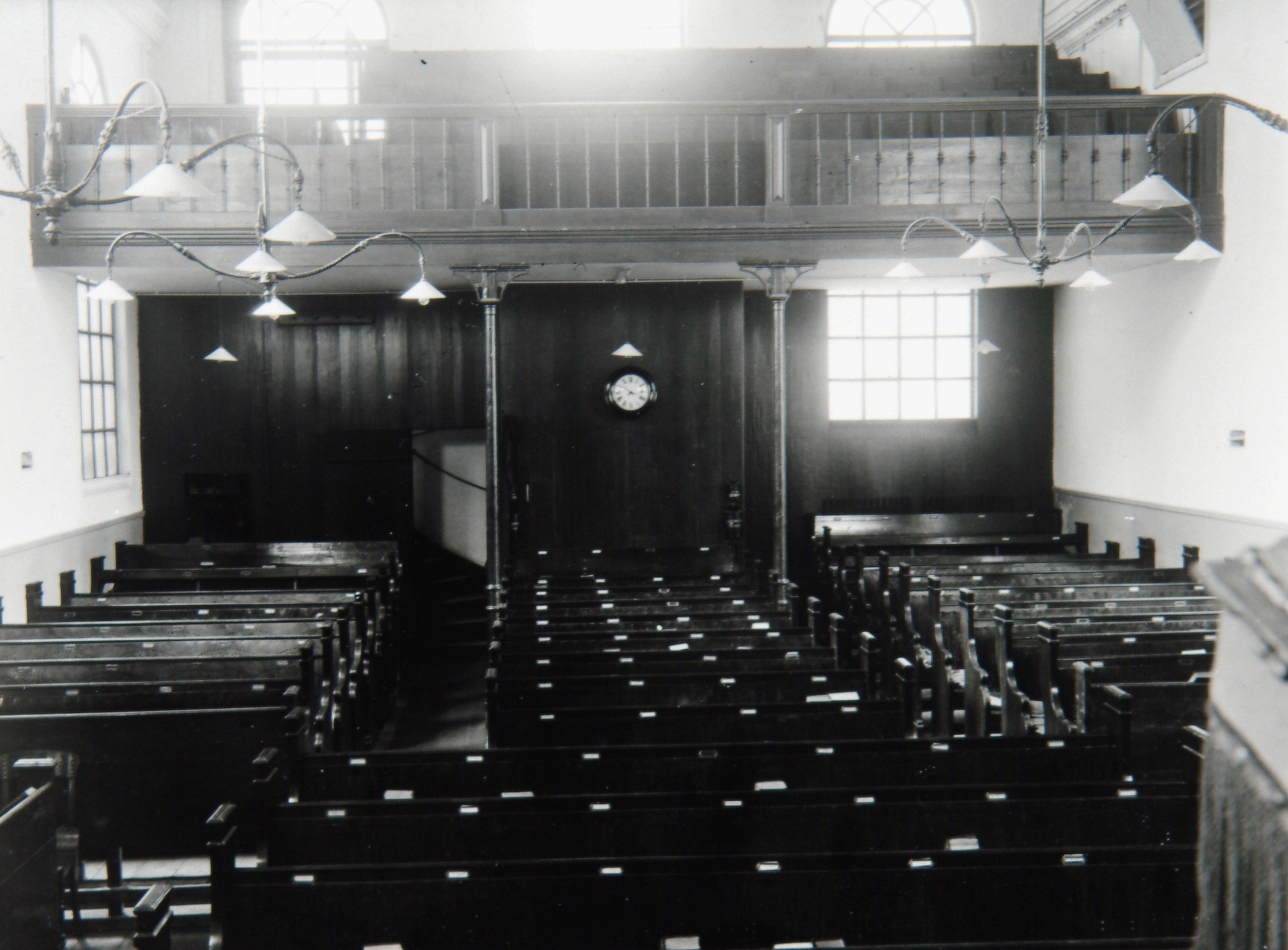 - Interieur van de oude kerk van de Vrije Evangelische Gemeente aan de Vrieseweg. Deze kerk werd in 1935 afgebroken en vervangen door een nieuwe.