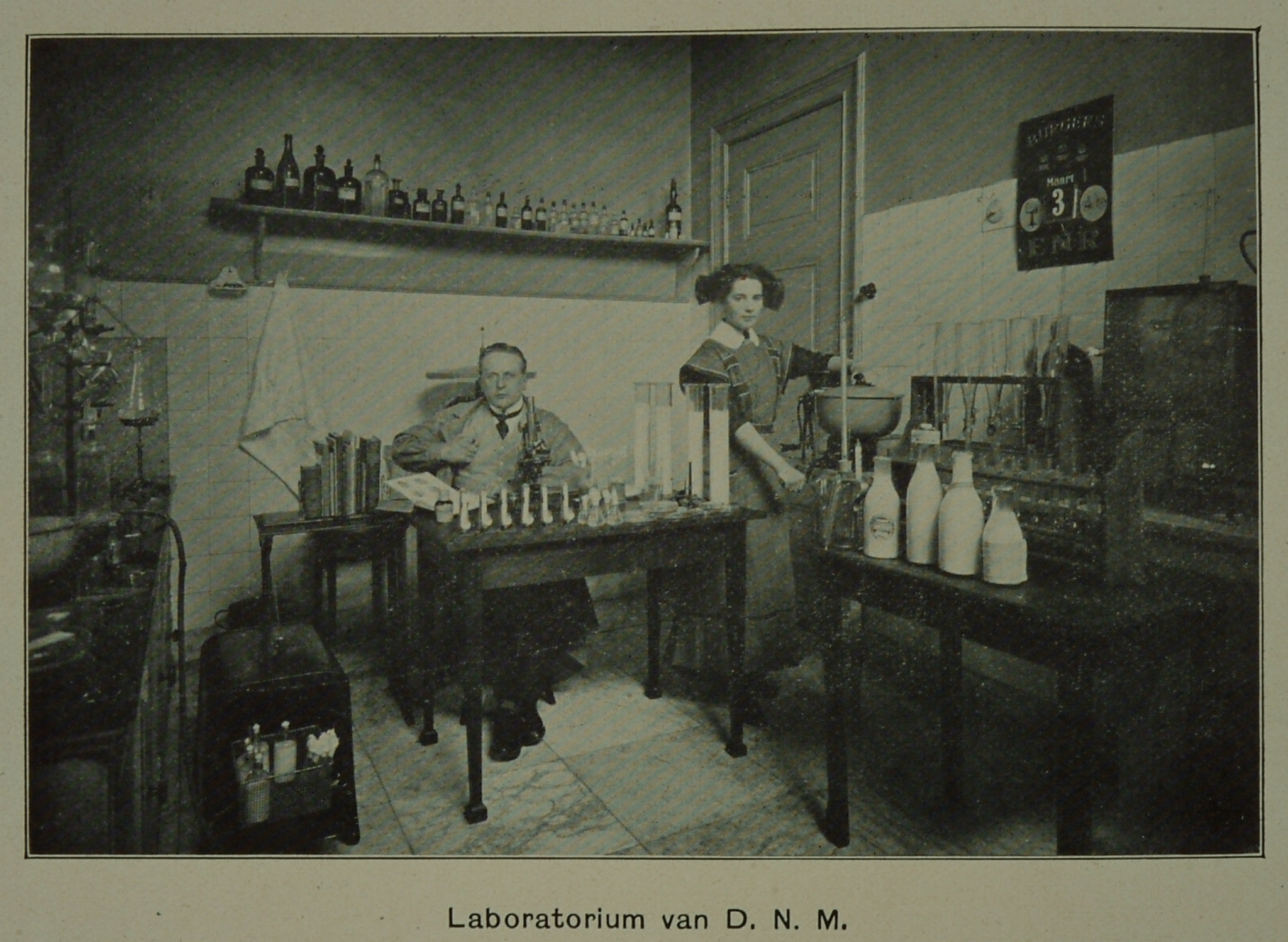 Laboratorium N.V. De Nieuwe Melkinrichting, oostzijde Bagijnhof (oud nummer 40 en 42) vanaf 1912. Melkfabriek gesloopt en bebouwd met de C&A in 1929.