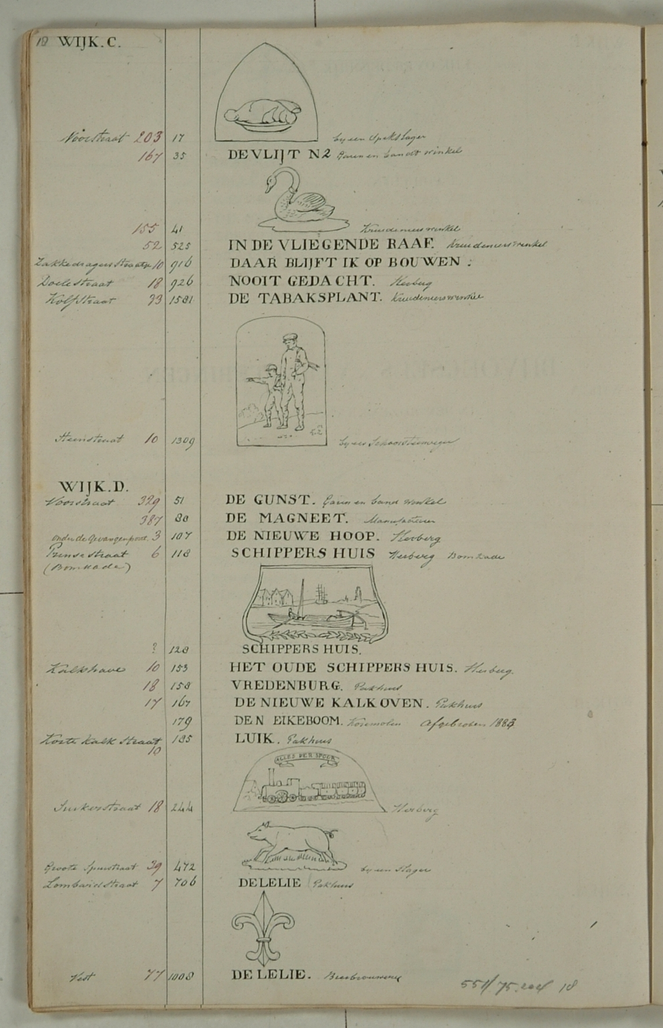 (18) namen/uithangborden van winkels en pakhuizen (blekerijen, molens) 1873 (en na 1884) ---- garen en bandt winkel De Vlijt N. 2; kruidenierswinkel In de Vliegende Raaf; Daar blijft Ik Op Bouwen; herberg Nooit Gedacht; kruidenierswinkel De Tabaksplant; garen en bandwinkel De Gunst; manufacturen De Magneet; herberg De Nieuwe Hoop; herberg Schippershuis; herberg Het Oude Schippershuis; pakhuis Vredenburg; pakhuis De Nieuwe Kalkoven; korenmolen Den Eikeboom; pakhuis Luik; herberg Alles per spoor; pakhuis De Lelie;