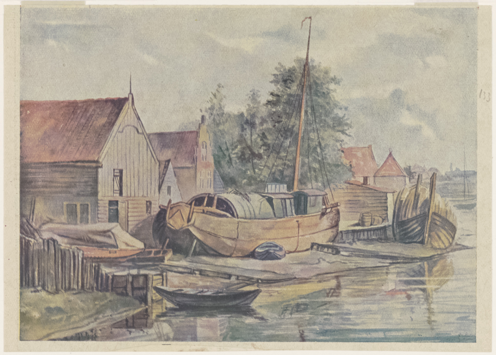 - Aquarel door J. Rutten van scheepmakerij van Pieter Hoebee aan de Hellingen.