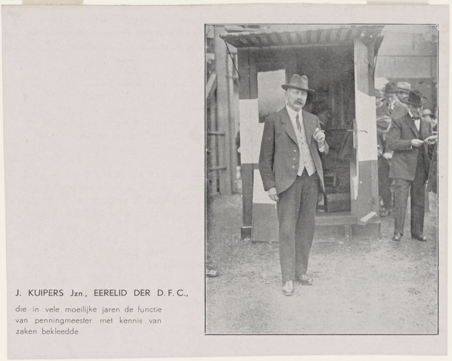 - De heer Jan Kuipers - erelid van DFC - bij het loket voor kaartverkoop bij het voetbalveld aan de Markettenweg.