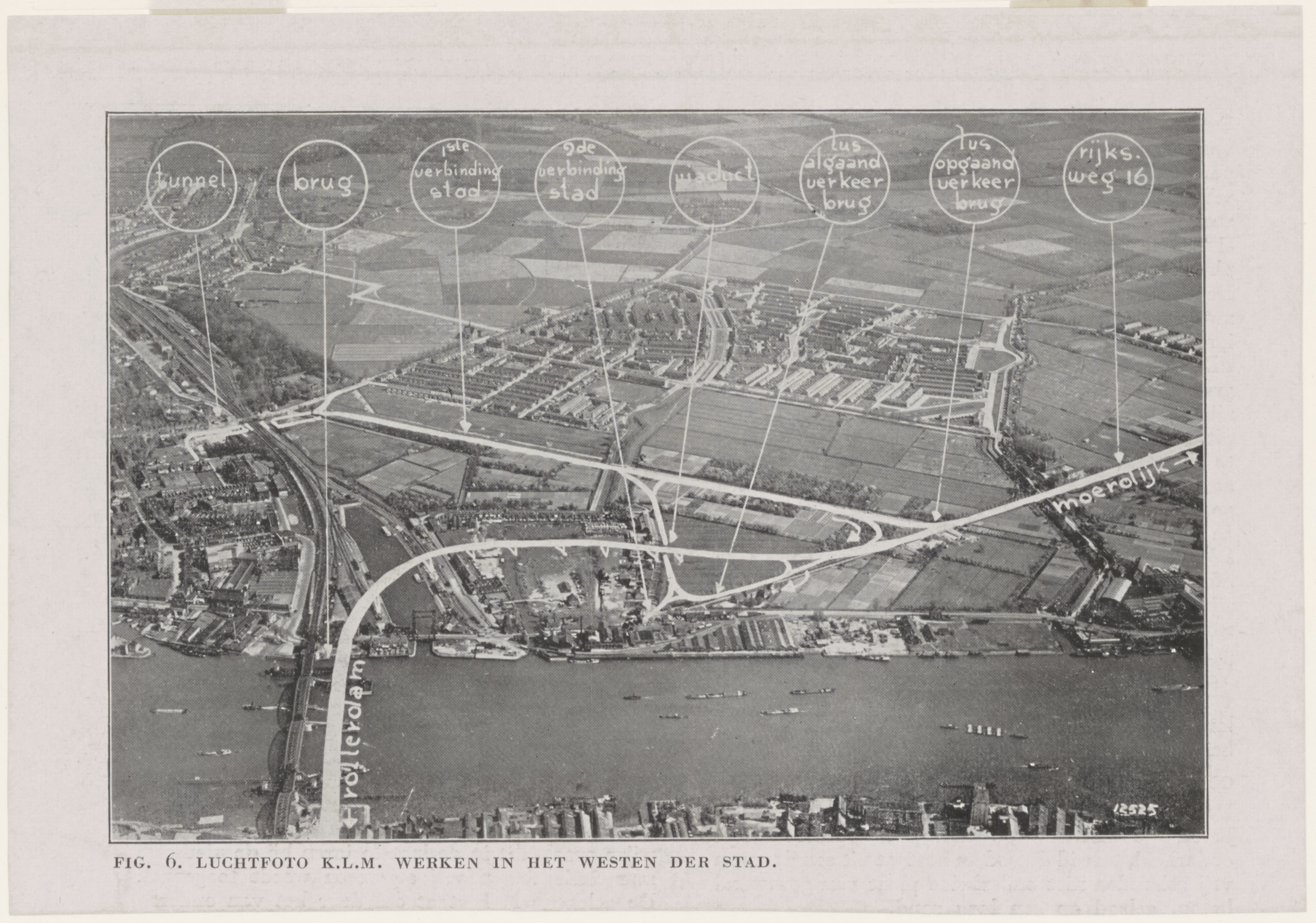 - Luchtfoto van het verkeersplan bij de bouw van de Zwijndrechtse brug over de Oude Maas.