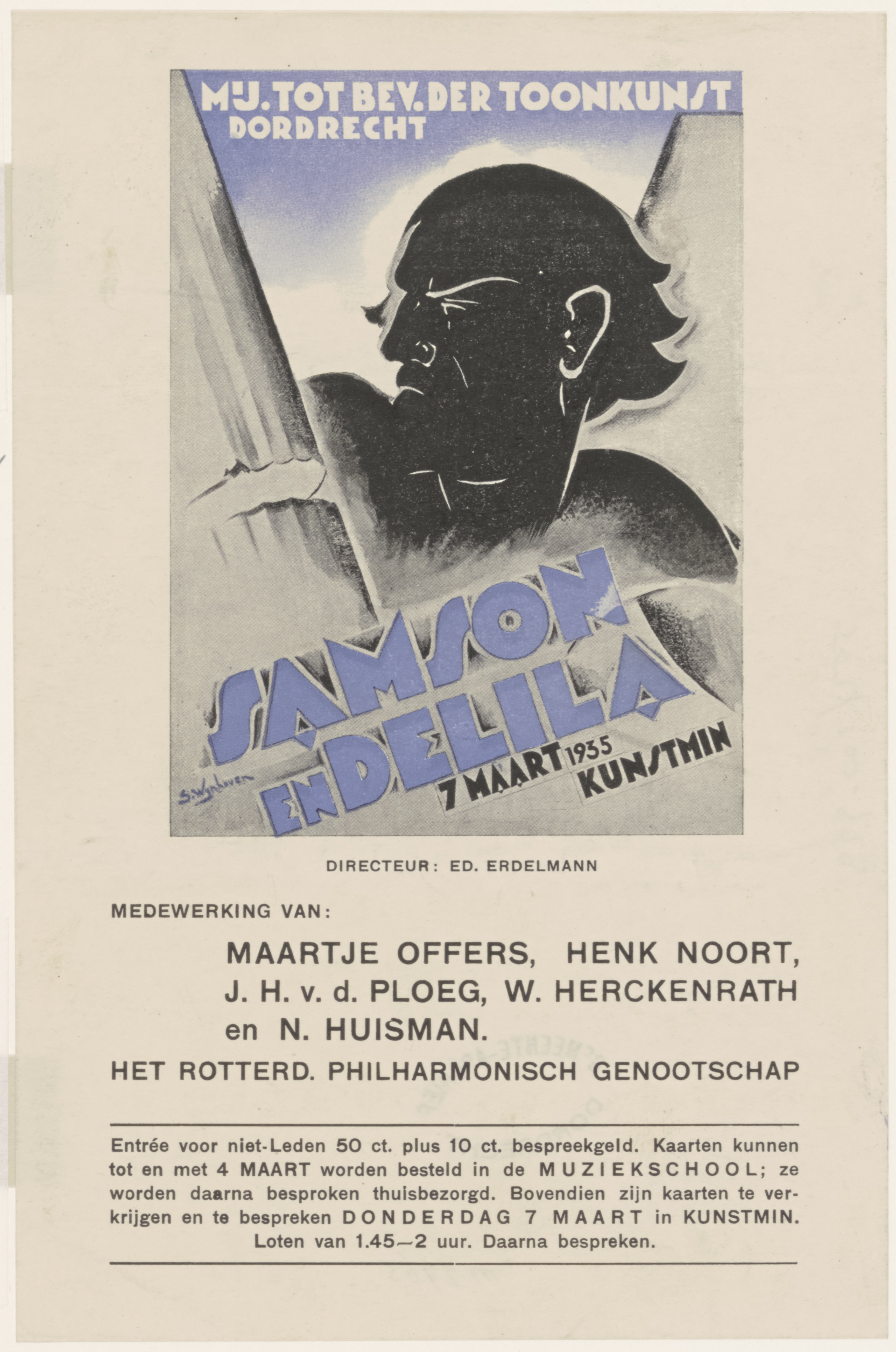- Affiche voor de uitvoering van Samson en Delila door de Maatschappij tot bevordering der Toonkunst op 7 maart 1935 in het Kunstmin.