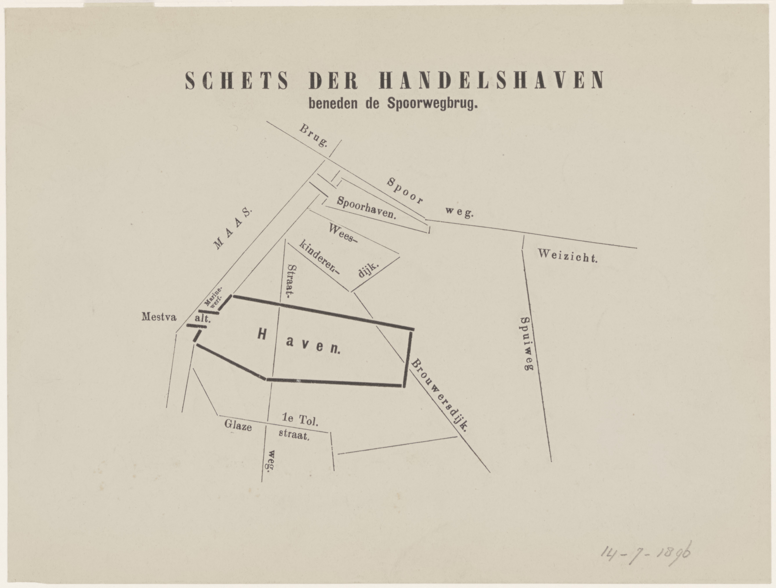 - Landkaart van niet gerealiseerd plan voor de aanleg van de handelshaven tussen Glazenstraat en Weeskinderendijk.