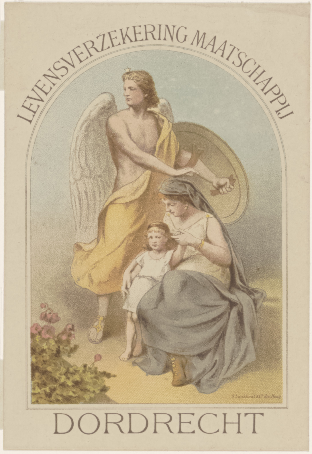Reclameplaat van de Levensverzekering Maatschappij Dordrecht met de afbeelding van een weduwe en kind, die door een engel met schild worden beschermd.