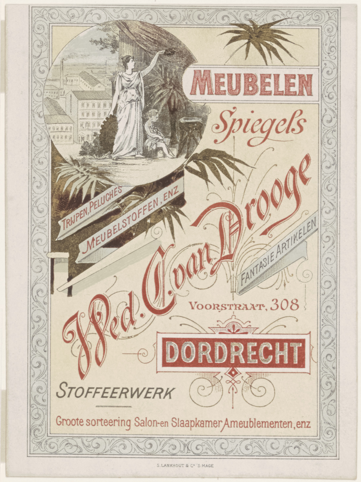 Reclameplaat van meubelhandel en stoffeerderij Wed. C. van Drooge op de Voorstraat.