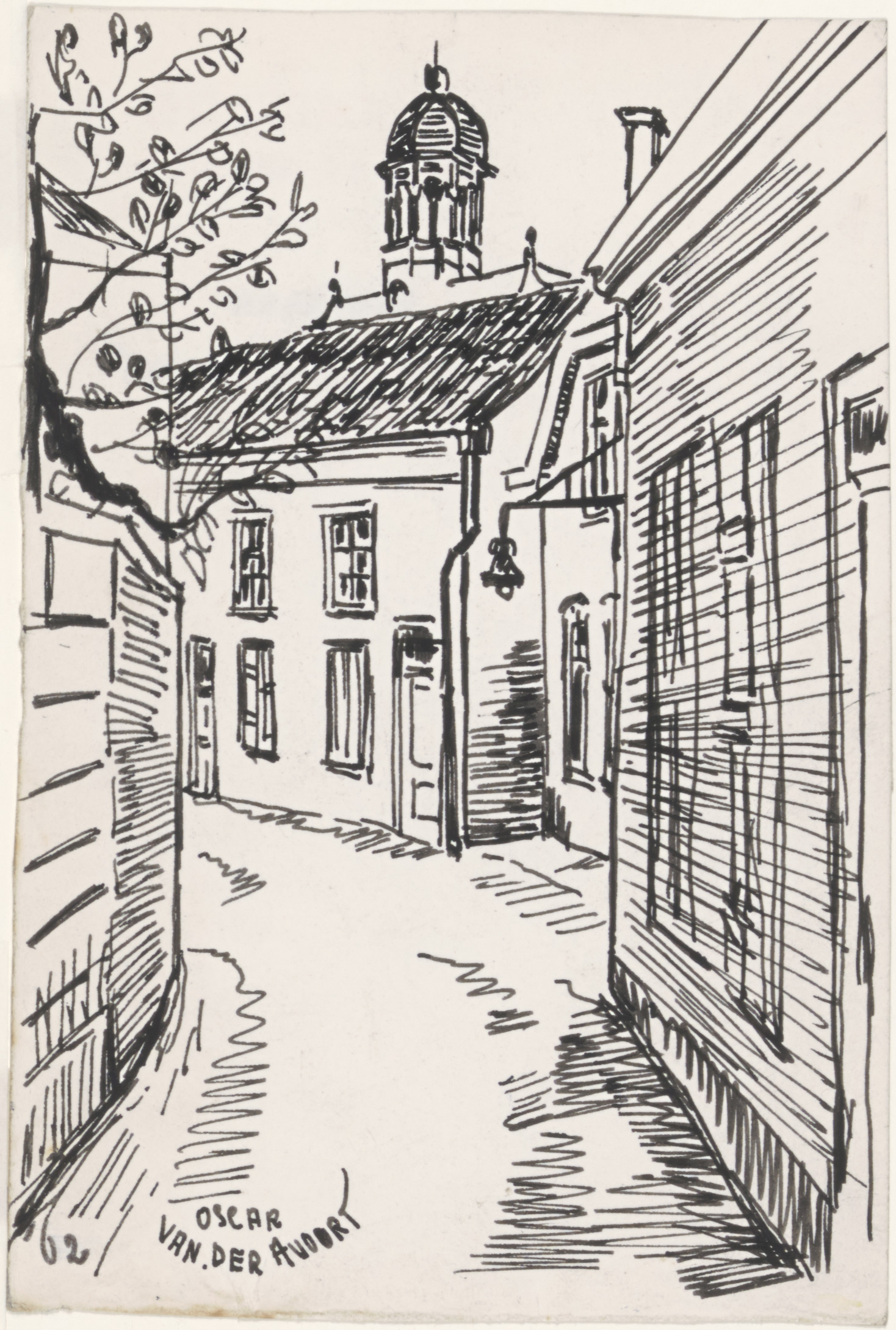 - Tekening door Oscar van der Avoort van het steegje Achterom. Het torentje is van de Nutsspaarbank op de hoek Bagijnhof / Johan de Wittstraat.