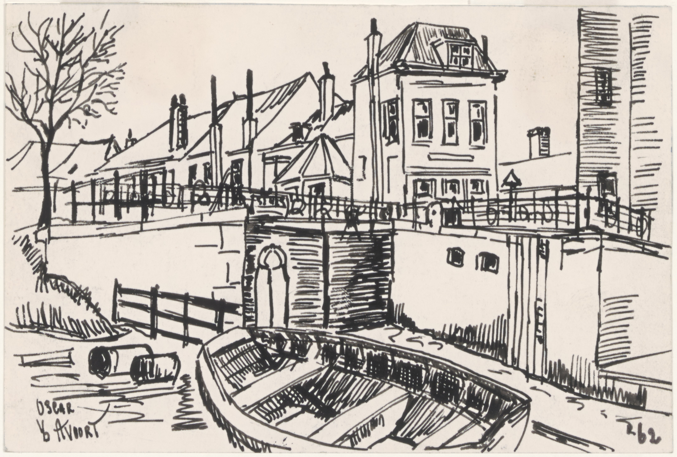 Tekening door Oscar van der Avoort van de Noordersluisbrug en de achterzijde van panden aan de Vest.
