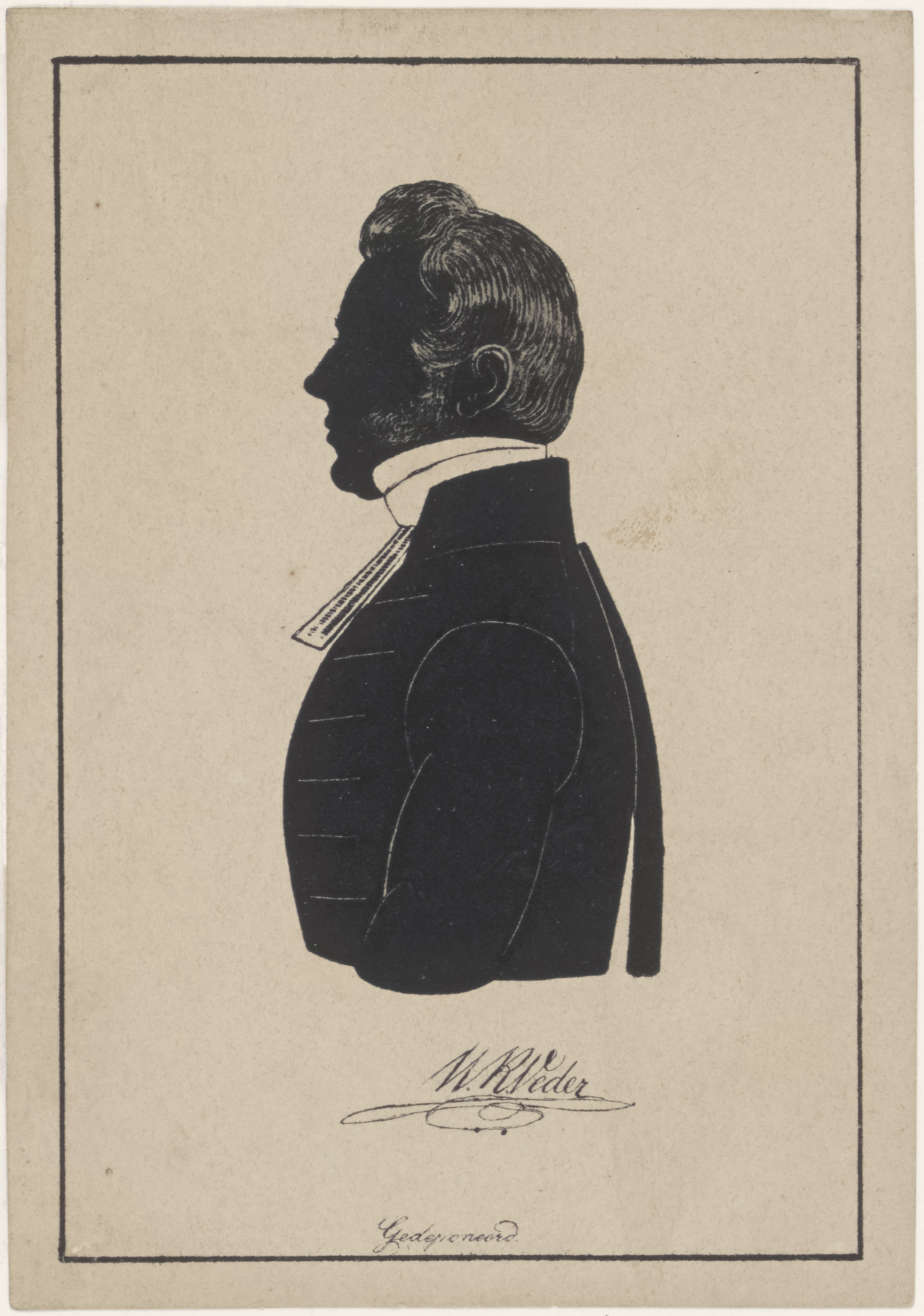 Silhouette van Dr. William Robert Veder met facsimile van zijn handtekening. Geboren in Rotterdam 1808 en overleden in Amersfoort 1882. Hervormd predikant in Dordrecht 1842-1874. In 1830/31 vrijwillig Leids Jager.