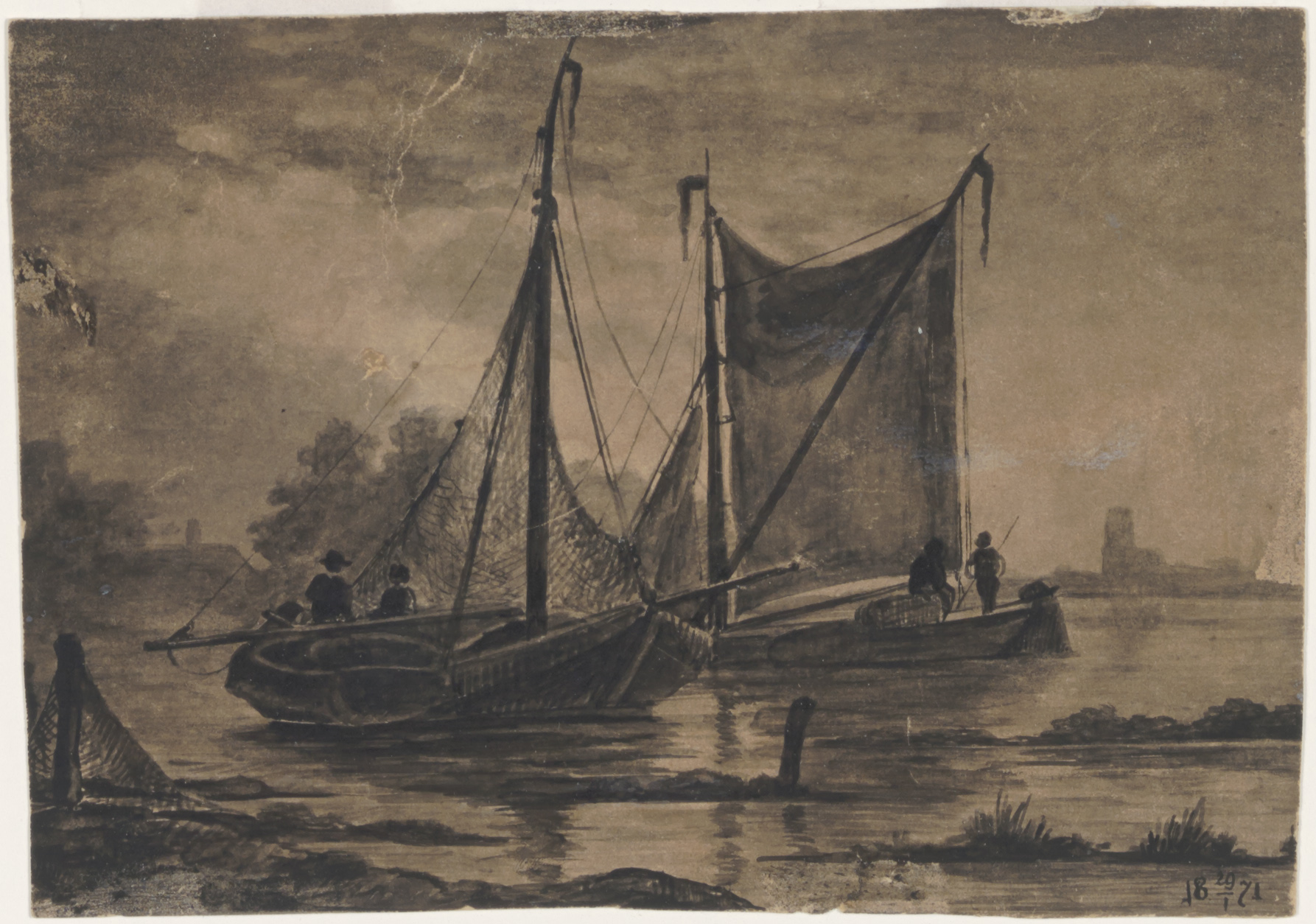 tekening - twee zeilschepen, rivier, zicht op Grote Kerk, 29-1-1871