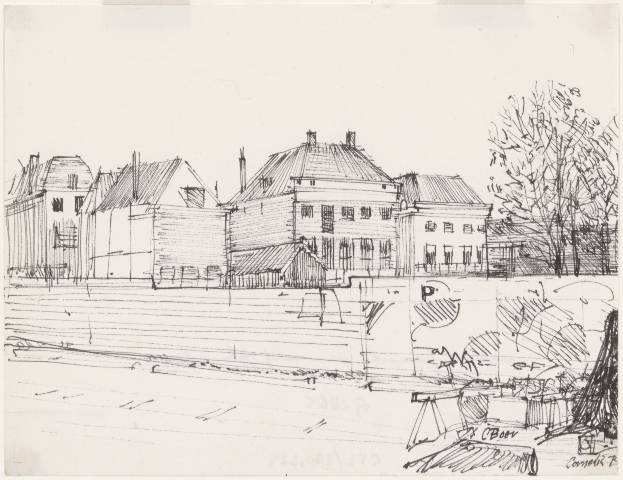 - Tekening van de achterzijde woningen aan de Groenmarkt gezien vanaf de Grote Markt.