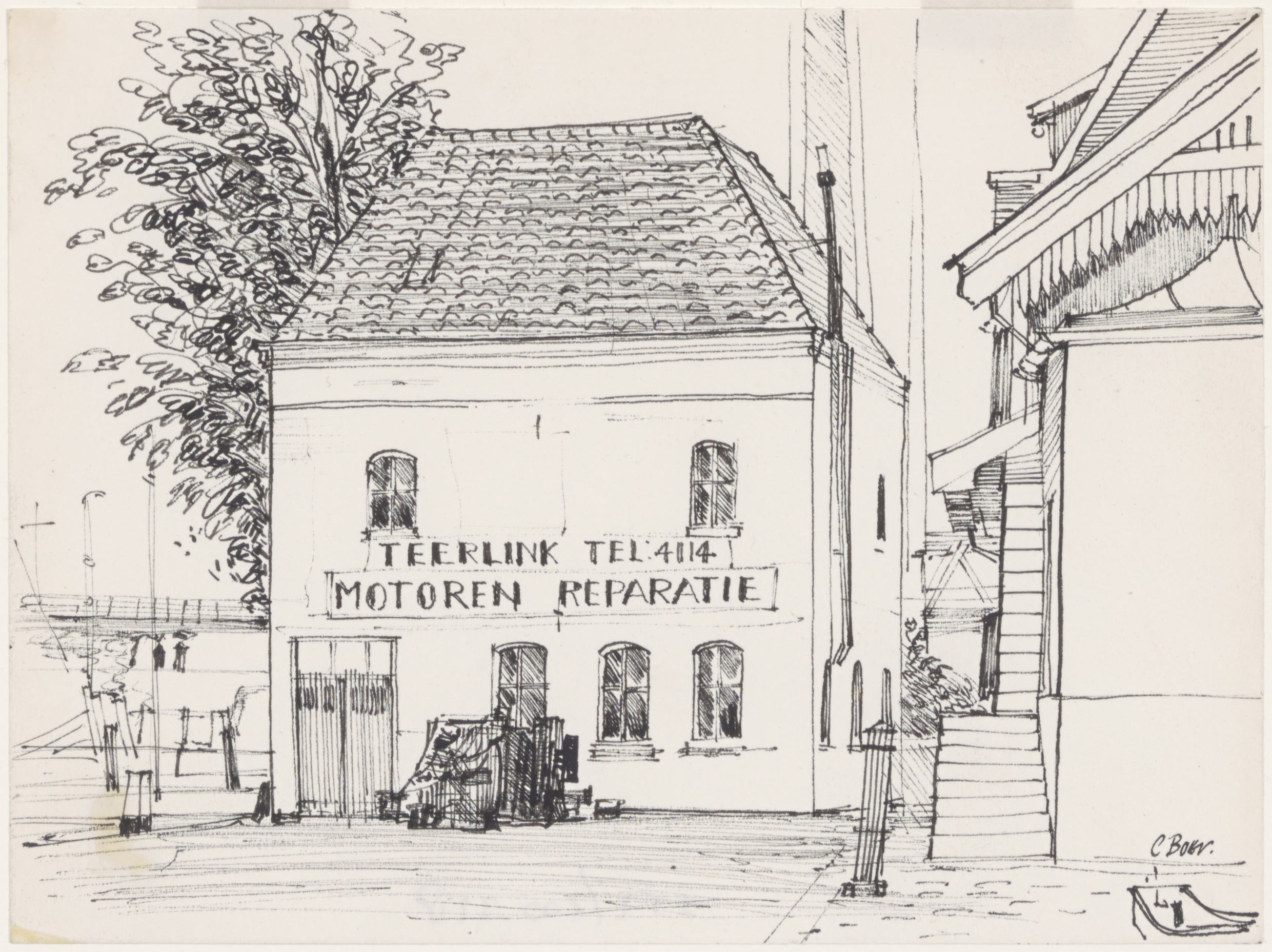 - Pand van Teerlink aan de Buiten Kalkhaven. Rechts de brugwachterswoning van de Draaibrug.