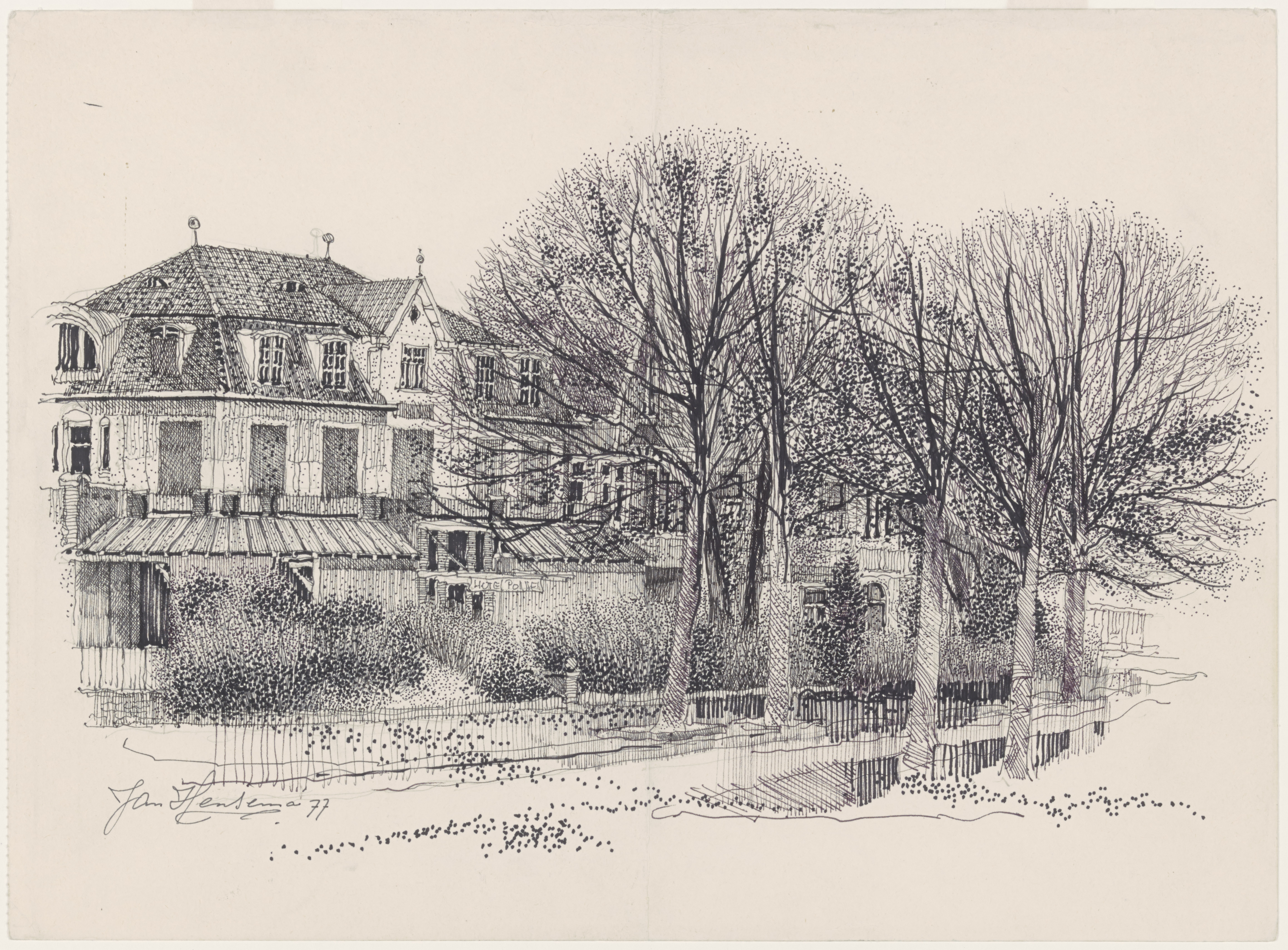 Tekening door Jan Hensema van Hotel Ponsen aan de Stationsweg.