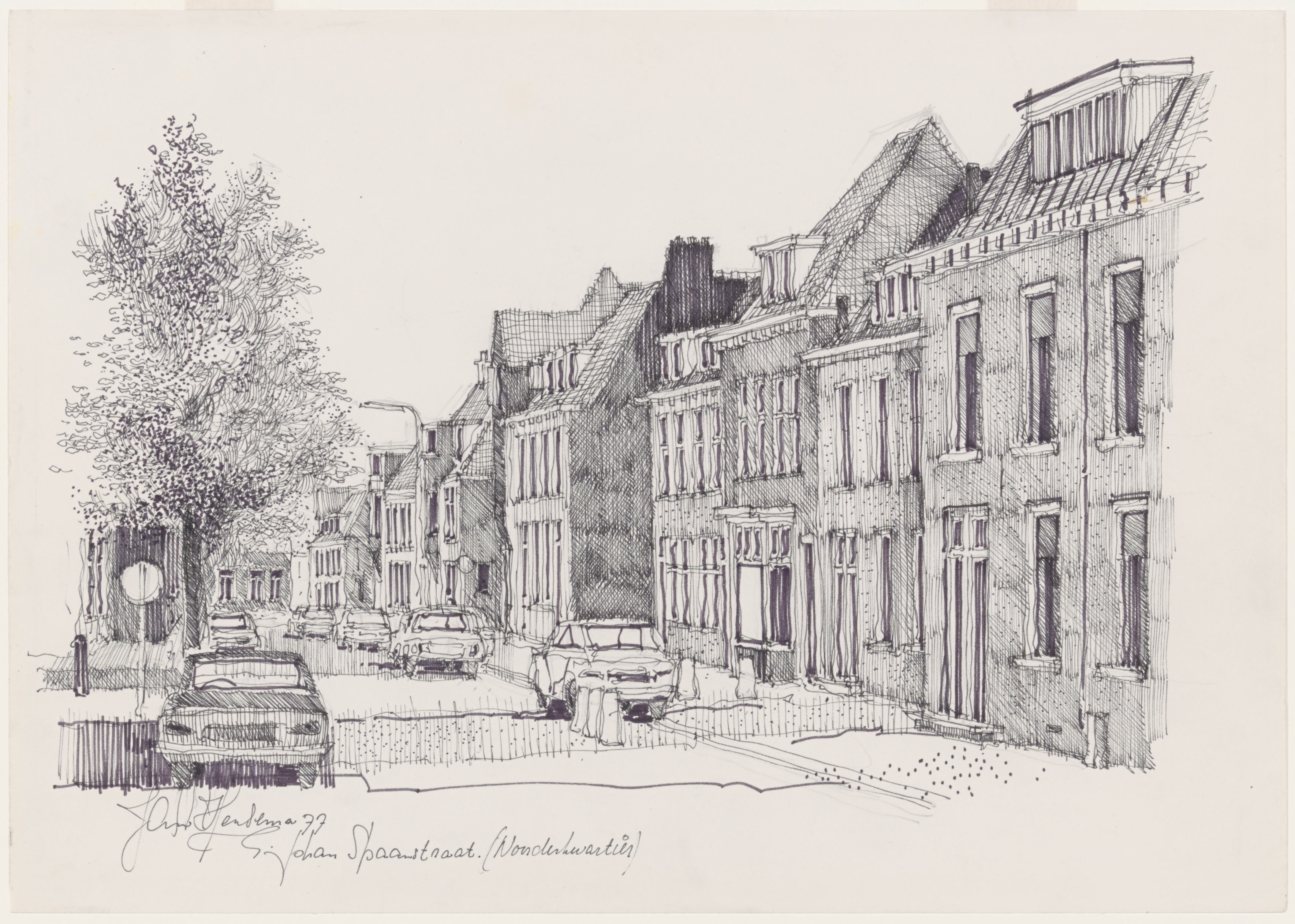 - Tekening door Jan Hensema van de Johannes Spaanstraat richting Merwedestraat.