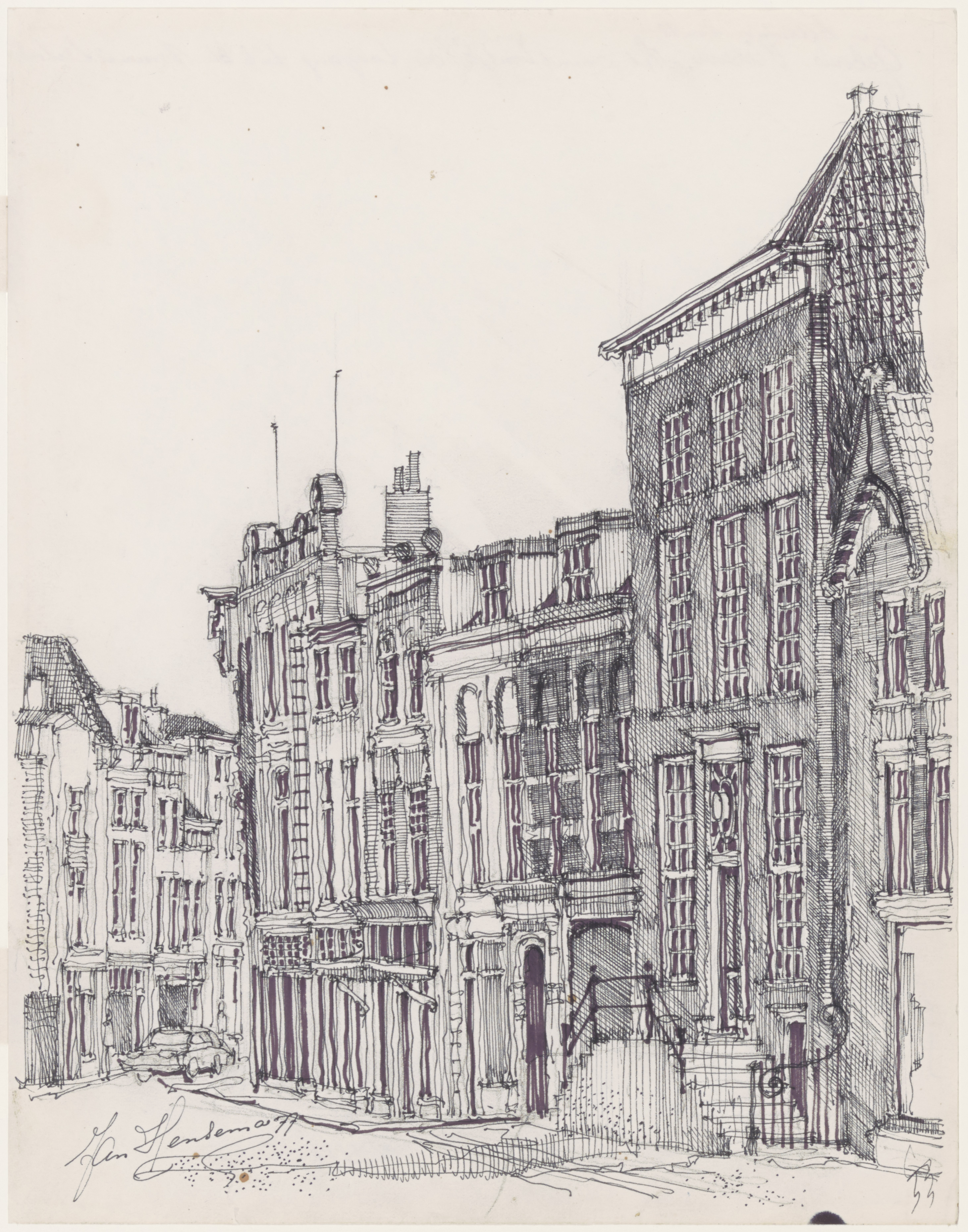 Tekening door Jan Hensema van de Voorstraat, Rechts gebouw Pictutra, links daarvan het …