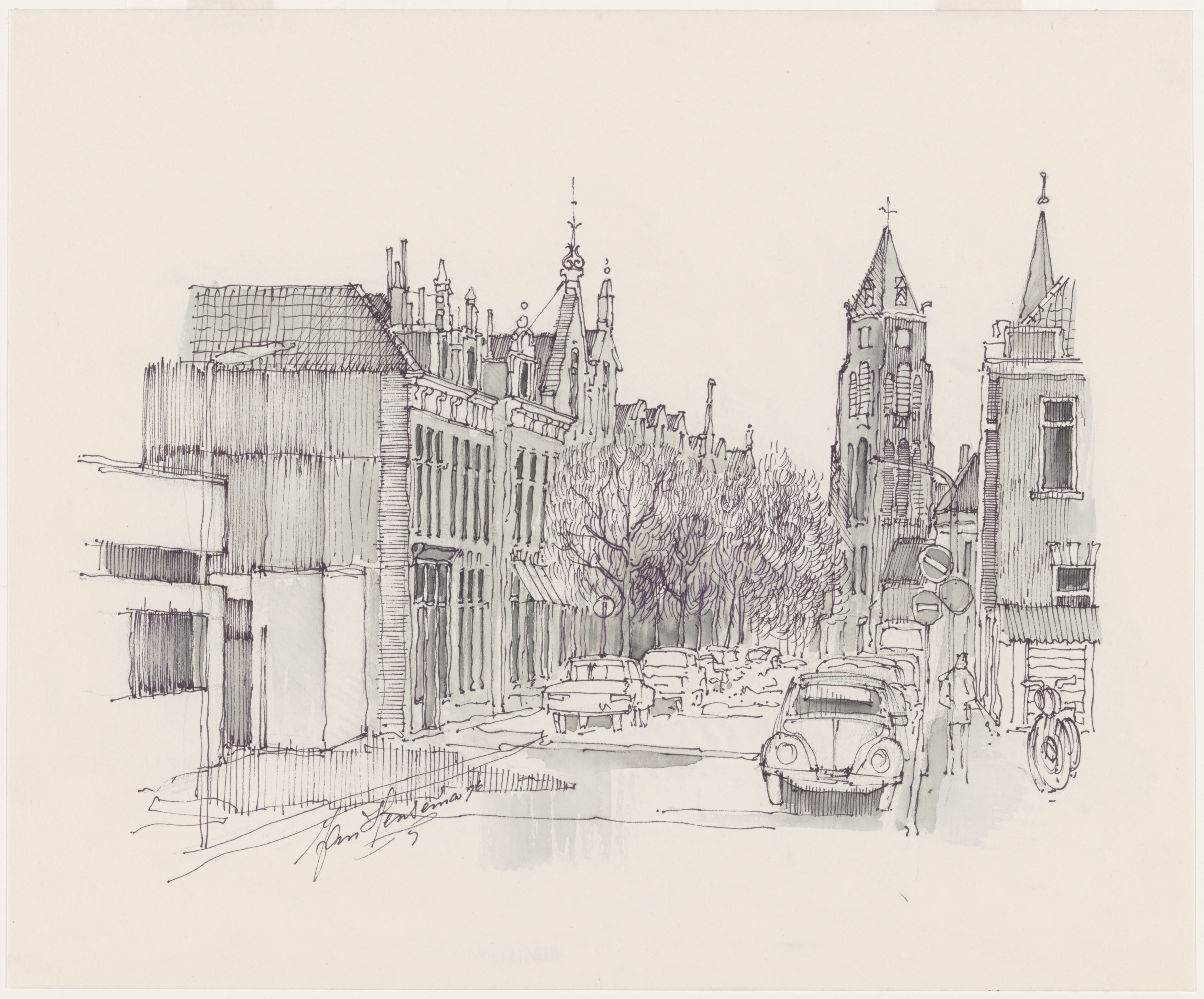 - Tekening door Jan Hensema van de Koningin Wilhelminastraat in de richting van de Wilhelminakerk.