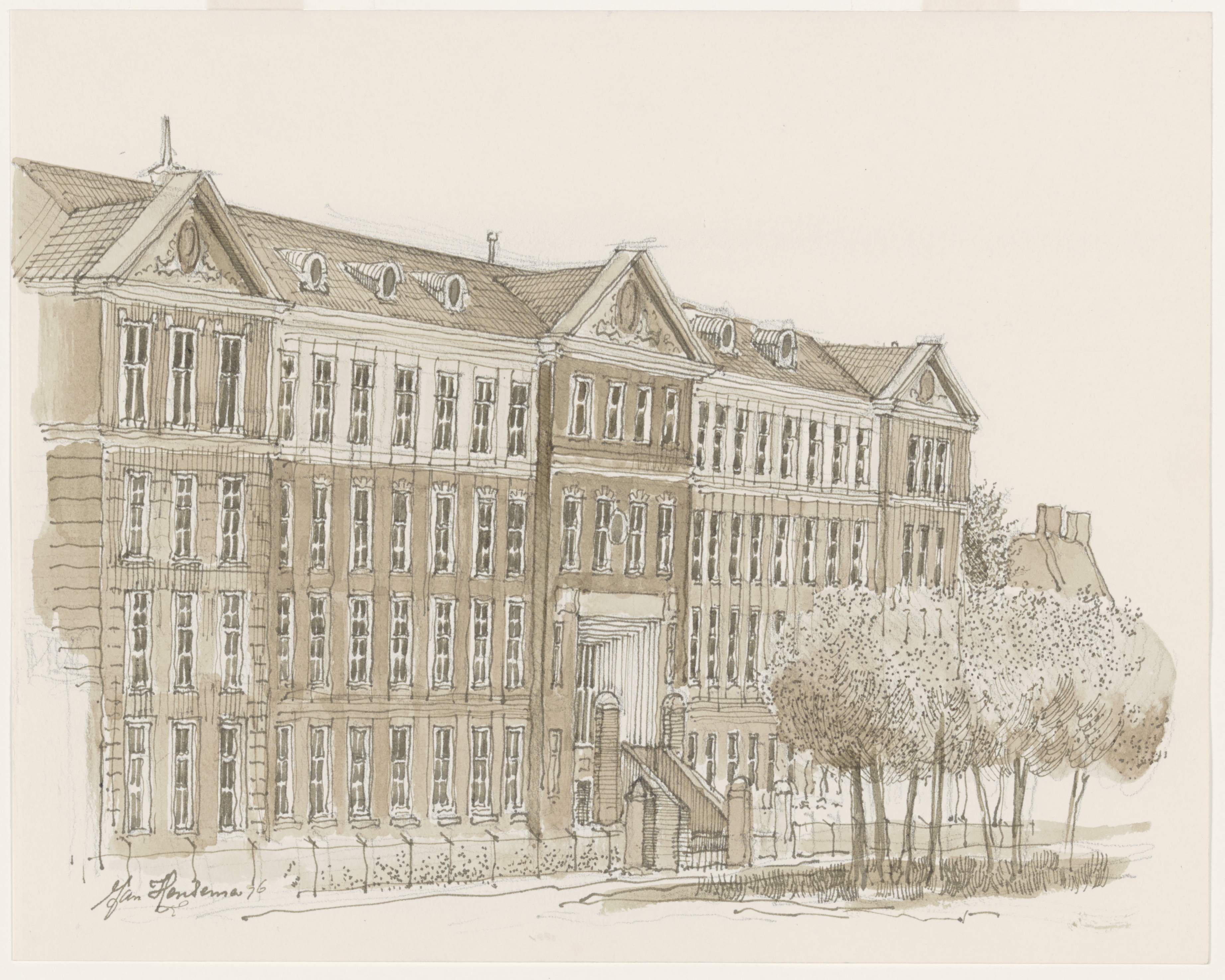 - Tekening door Jan Hensema van de HTS aan de Oranjelaan.