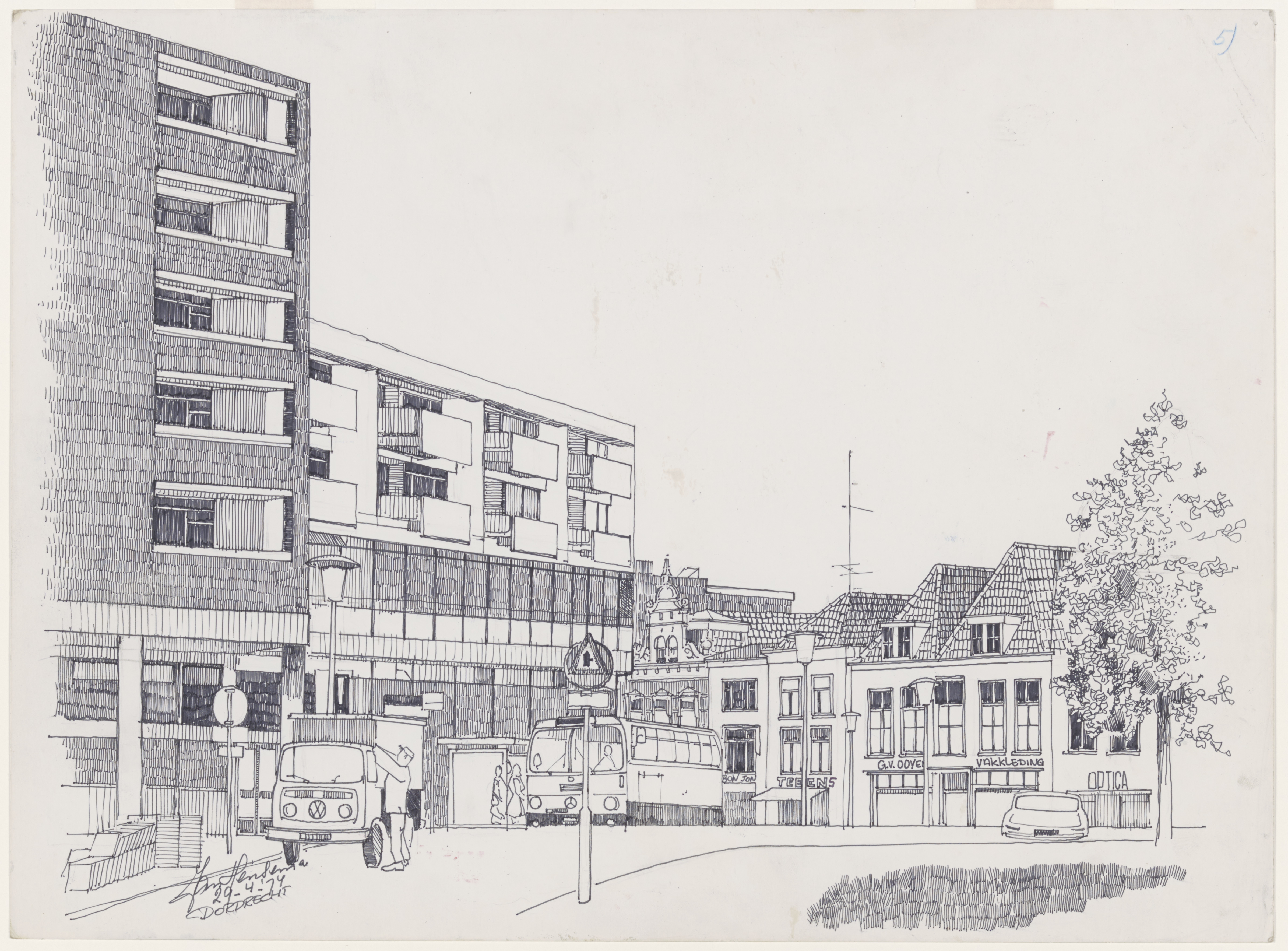 - Tekening door Jan Hensema van de Johan de Wittstraat en het Bagijnhof.