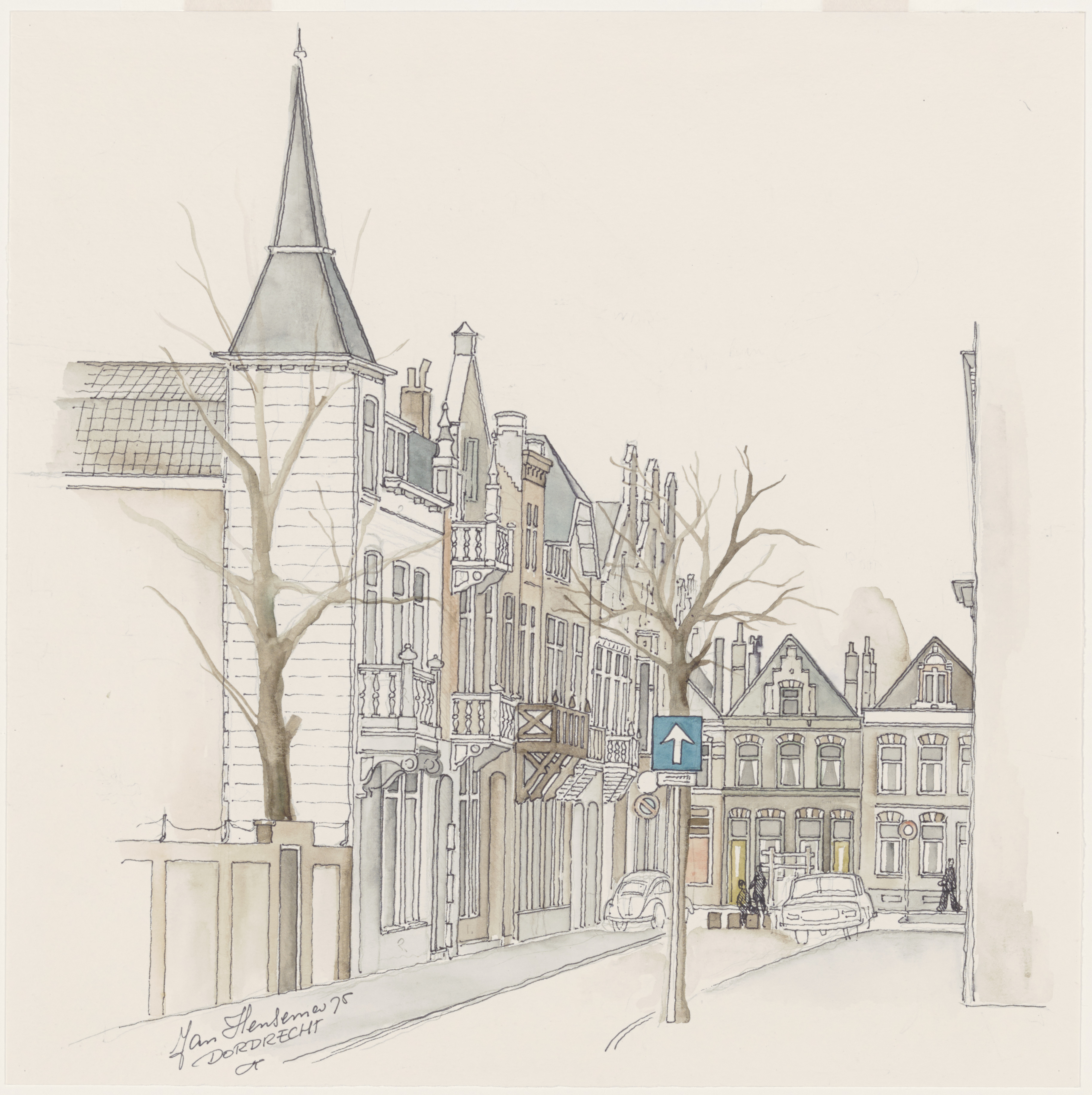 - Tekening door Jan Hensema van de Cornelis van Beverenstraat in de richting van de Koningin Wilhelminastraat. Links vooraan Huis Beversteijn.
